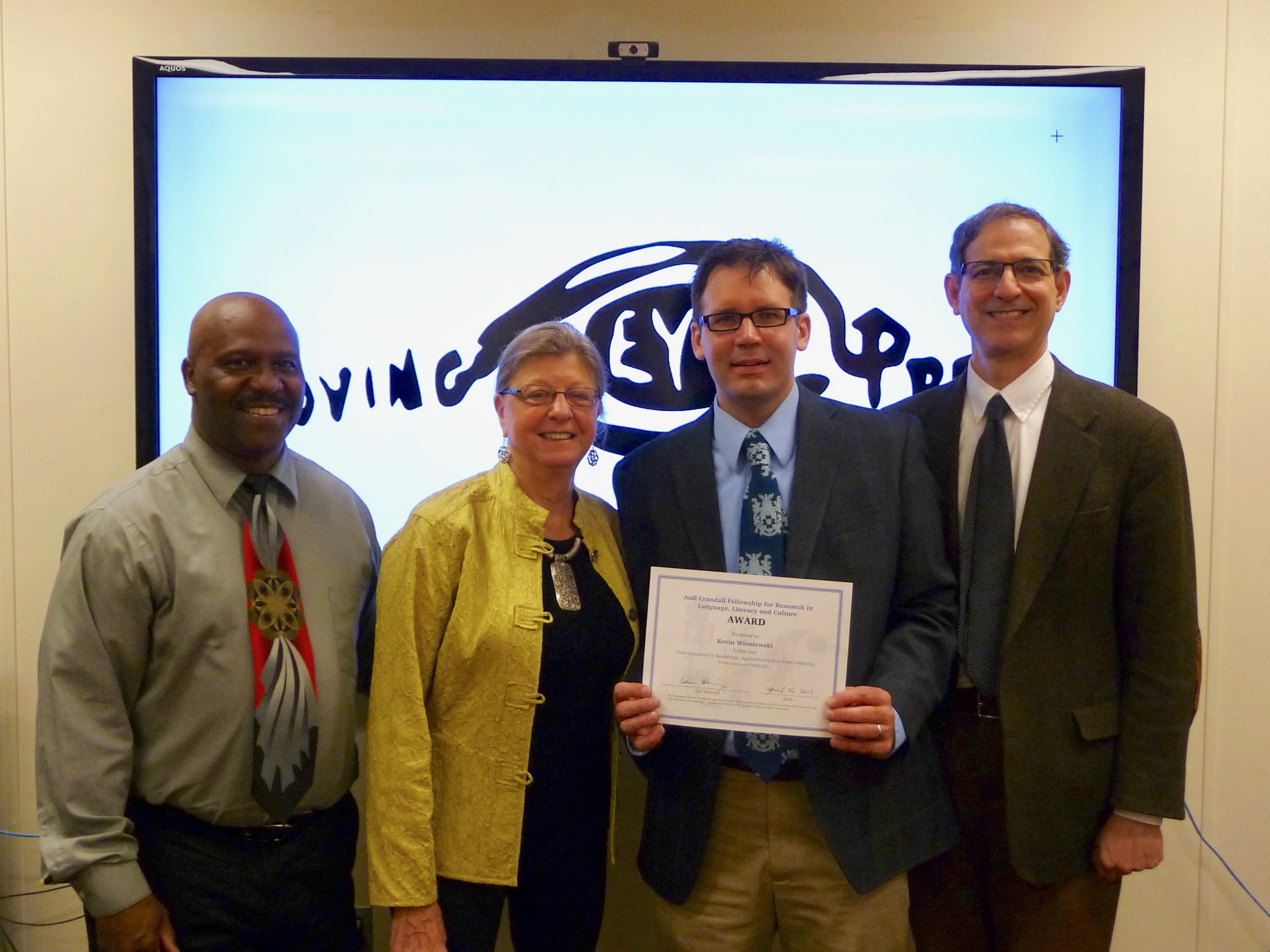 On April 26th, Dr. Jodi Crandall, founder of the LLC Program, presented to Kevin Wisniewski, PhD Candidate from Cohort 15, the Jodi Crandall Fellowship for Research in Language, Literacy and Culture Award. His project is called “From Repository to Readership: Applied Research in Book Publishing, Production and Publicity.” Working with Dr. Craig Saper, Kevin will investigate the printing, design, and distribution strategies of selected 1930s ephemera. He plans on reprinting and publishing a broadside and pamphlet to explore the larger, participatory system of publishing that functions as a form of civic engagement and public scholarship.