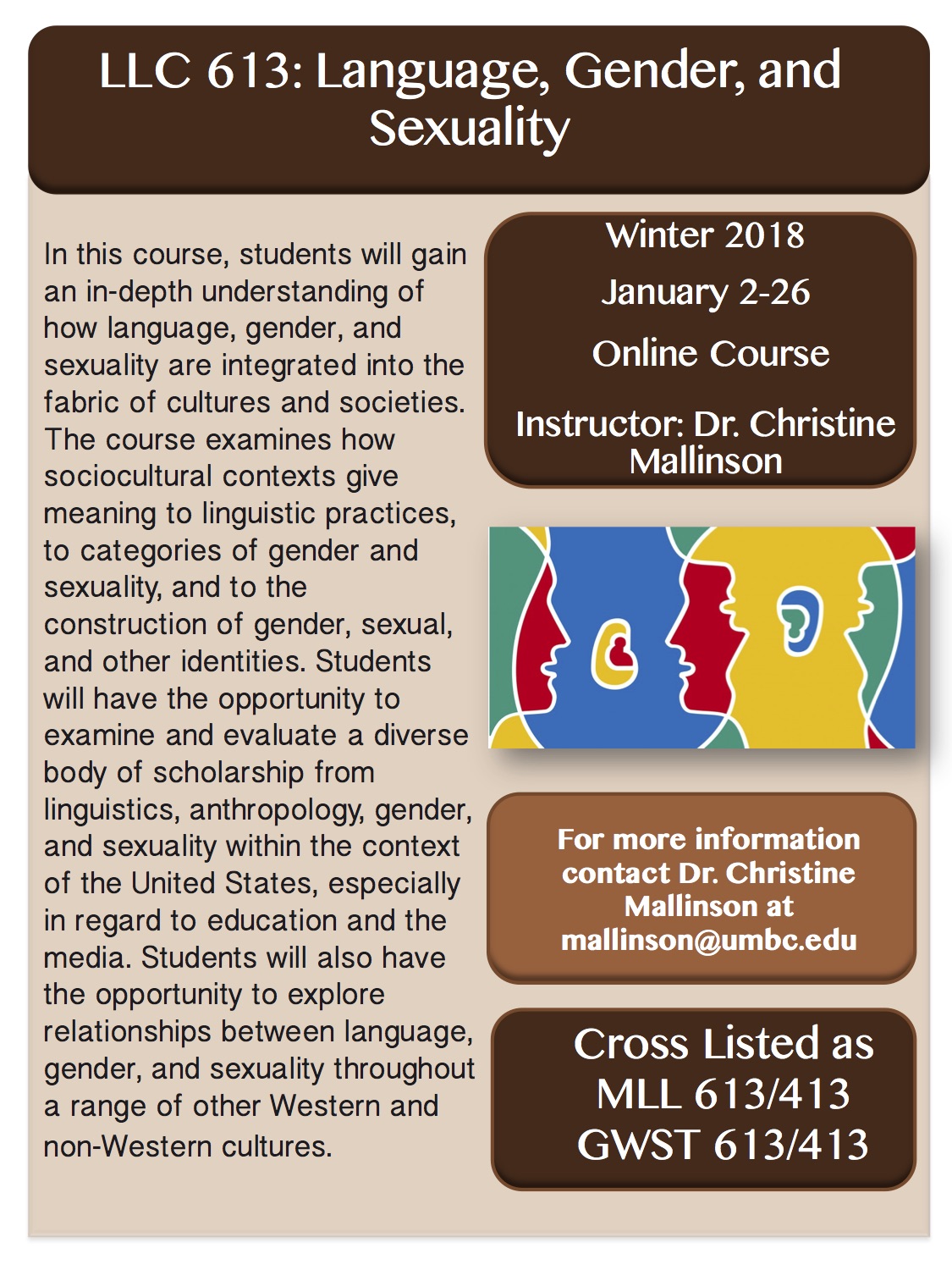 Dr. Christine Mallinson is offering the course LLC 613 Language, Gender, and Sexuality (also listed as MLL 613/413 - GWST 613/413). See information about the course in the flyer below.