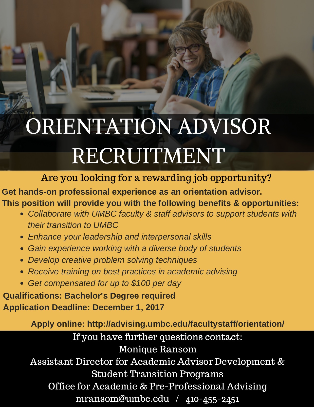 The OAPA is accepting applications through December 1st for new advisors. Applications can be completed electronically and upload online at: http://advising.umbc.edu/facultystaff/orientation/orientation_upload/. This will be a great opportunity for graduate students who will be enrolled at UMBC for Spring 2018.