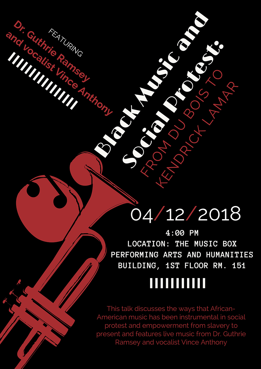 Please consider joining the English Department at UMBC for an exciting talk by Dr. Guthrie P. Ramsey, "Black Music and Social Protest: From Du Bois' Souls to Kendrick Lamar.” Dr. Ramsey was invited to UMBC as part of the Eminent Scholars Program sponsored by the Provost’s office. The talk will be on Thursday, April 12, at 4 p.m. in the Music Box (PAHB 151).