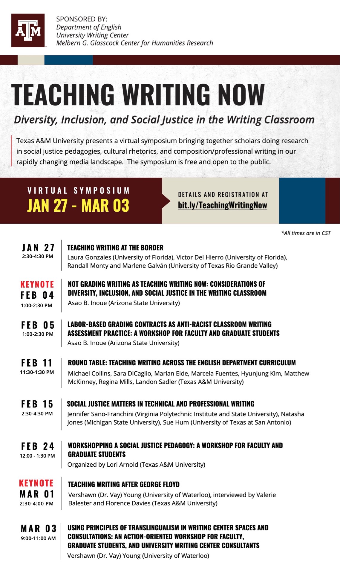 The Texas A&M Department of English invites you to a series of talks and workshops surrounding the topic of how we can better teach writing now by addressing diversity, inclusion, and social justice in the writing classroom. Events are aimed at bringing together scholars doing research in social justice pedagogies, cultural rhetorics, and composition/professional writing in our rapidly changing media landscape.