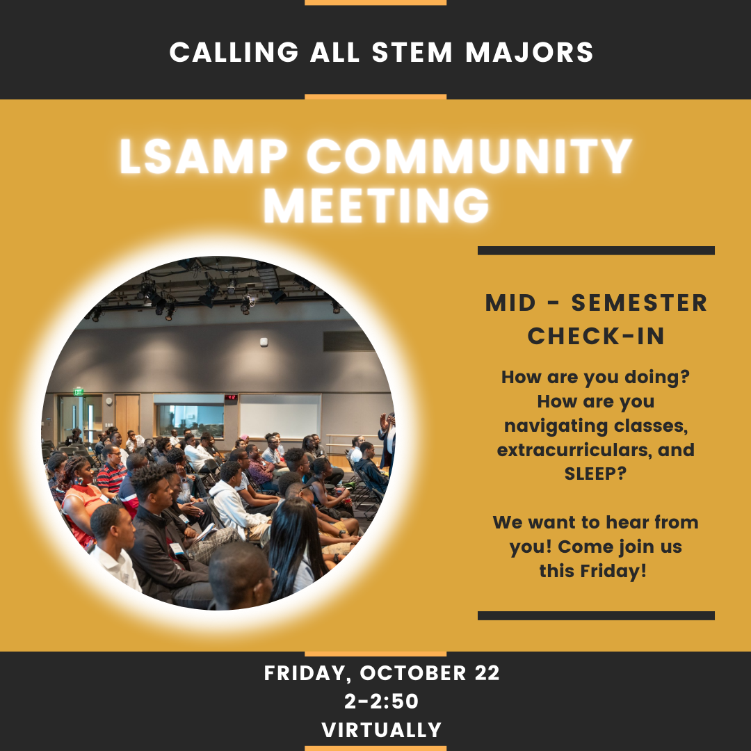 We're almost at the halfway point and want to check in to see how you all are doing. Come join us this Friday, October 22 at the All STEM LSAMP Community Meeting. If there are topics you would like us to discuss, please email them to lsamp@umbc.edu.