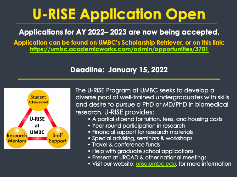 The U-RISE Program at UMBC is now seeking applicants. The U-RISE Program seeks to develop a diverse pool of well-trained undergraduates with skills and desire to pursue a PhD or MD/PhD in biomedical research. The scholarship is for full-time juniors and seniors.