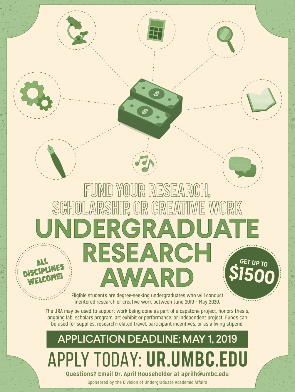URAs provide up to $1,500 to undergraduate students to support their research or creative work with a UMBC faculty mentor on an original project. UMBC students of all years and disciplines are invited to apply, as long as they will remain enrolled at UMBC long enough to complete the proposed work. There are special awards for entrepreneurs and social science scholars. We encourage international research and arts projects! Applications will open on March 1, and are due by May 1, 2020. Research proposal and mentor recommendation is required.