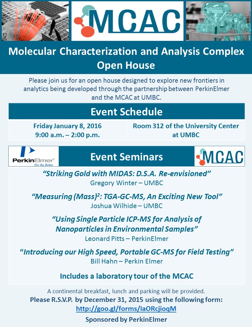Please join us for an open house designed to explore new frontiers in analytics being developed through the partnership between PerkinElmer and the MCAC at UMBC.