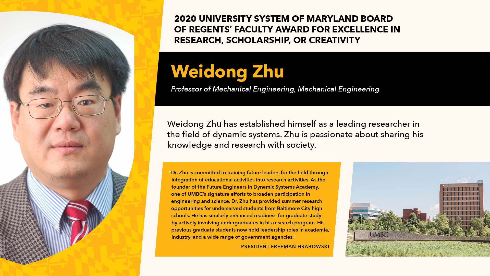 Dr. Zhu supports student research, and serves as a mentor to undergraduate and graduate students. Over his 20 years at UMBC, he has supported 43 undergraduate students in their research as they prepared for graduate studies. His passion for research extends beyond UMBC. He has worked to get high school students excited about research by providing opportunities to underserved students in Baltimore City. In 2004, he received a CAREER Award from the National Science Foundation, which he used to found the Future Engineers in Dynamic Systems Academy. The program works to broaden participation in engineering and science for high school students in Baltimore City high schools. More than 120 students have participated in the Academy.