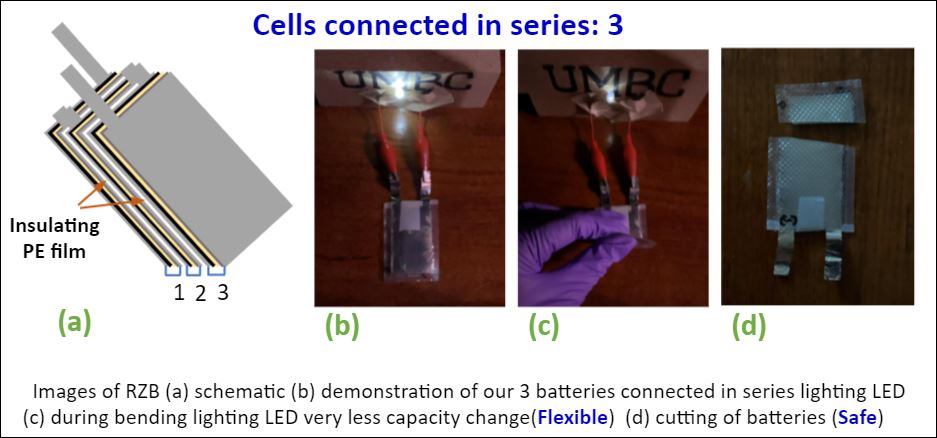 The objective of the funded project is to demonstrate a flexible rechargeable Zn battery (RZB) prototype and formulate a comprehensive plan for its commercialization for wearable device applications. Commercially available rechargeable batteries contain toxic, costly, and flammable materials (e.g., Li-based compounds and liquid electrolytes). These materials impose strict packaging requirements (to ensure safety) that result in rigid and bulky batteries of fixed shapes and sizes (e.g., coin cell, cylindrical, and prismatic). The funded project builds on the RZB technology (pioneered in Dr. Madan's lab at UMBC) that exploits abundantly available, non-toxic, and non-flammable materials (Zn for anode, MnO2 for cathode, and chitosan as gel electrolyte) to demonstrate a safe, scalable, and flexible RZB. By demonstrating the unique advantages of safety and design flexibility, which enables larger battery footprint and hence better performance, Dr. Madan expects to enable RZB commercialization for wearable device applications.