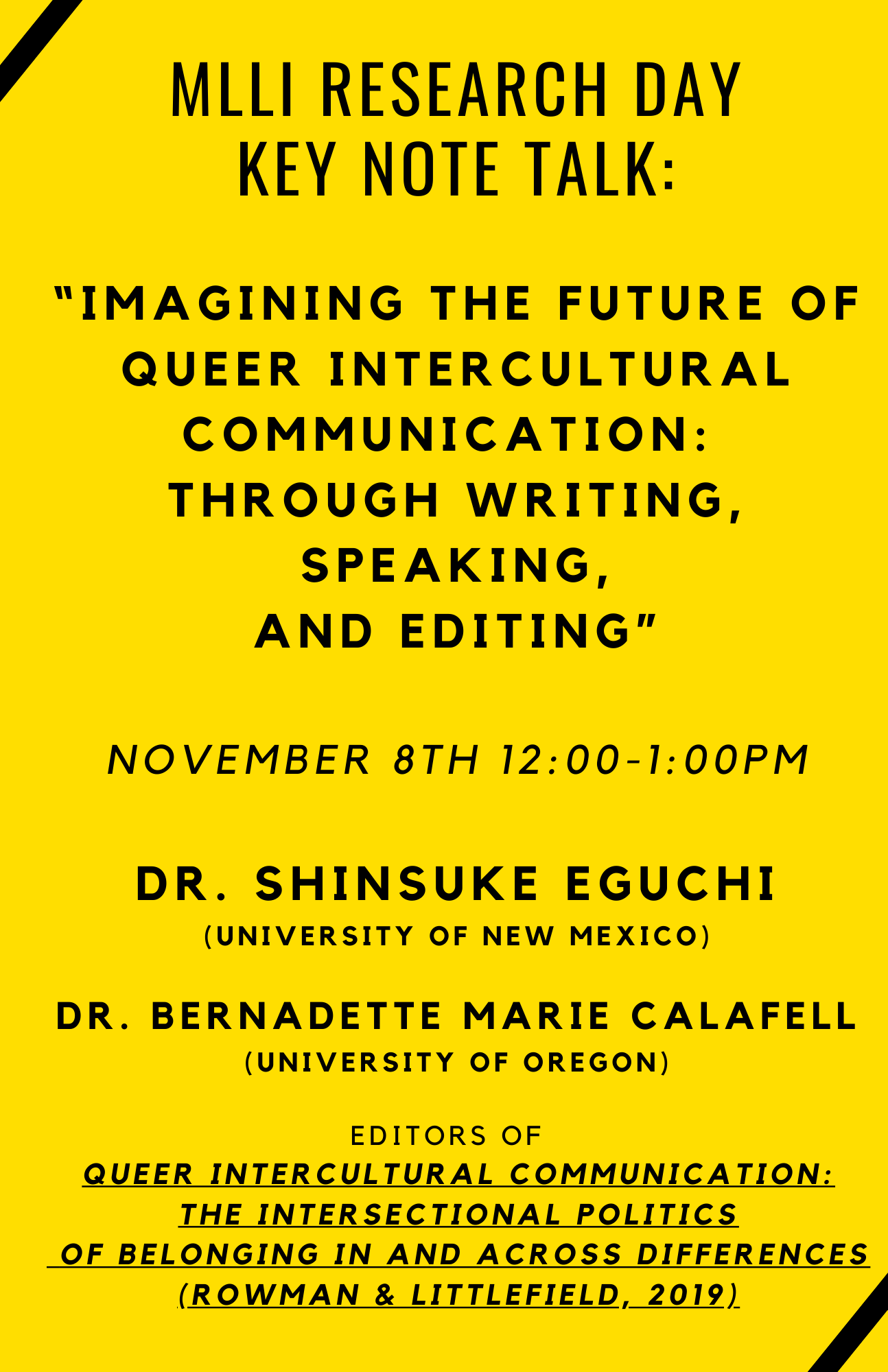 The 12:00-1:00 pm timeslot will be reserved for a closing keynote presentation by professors Dr. Eguchi (University of New Mexico) and Dr. Calafell (University of Oregon).