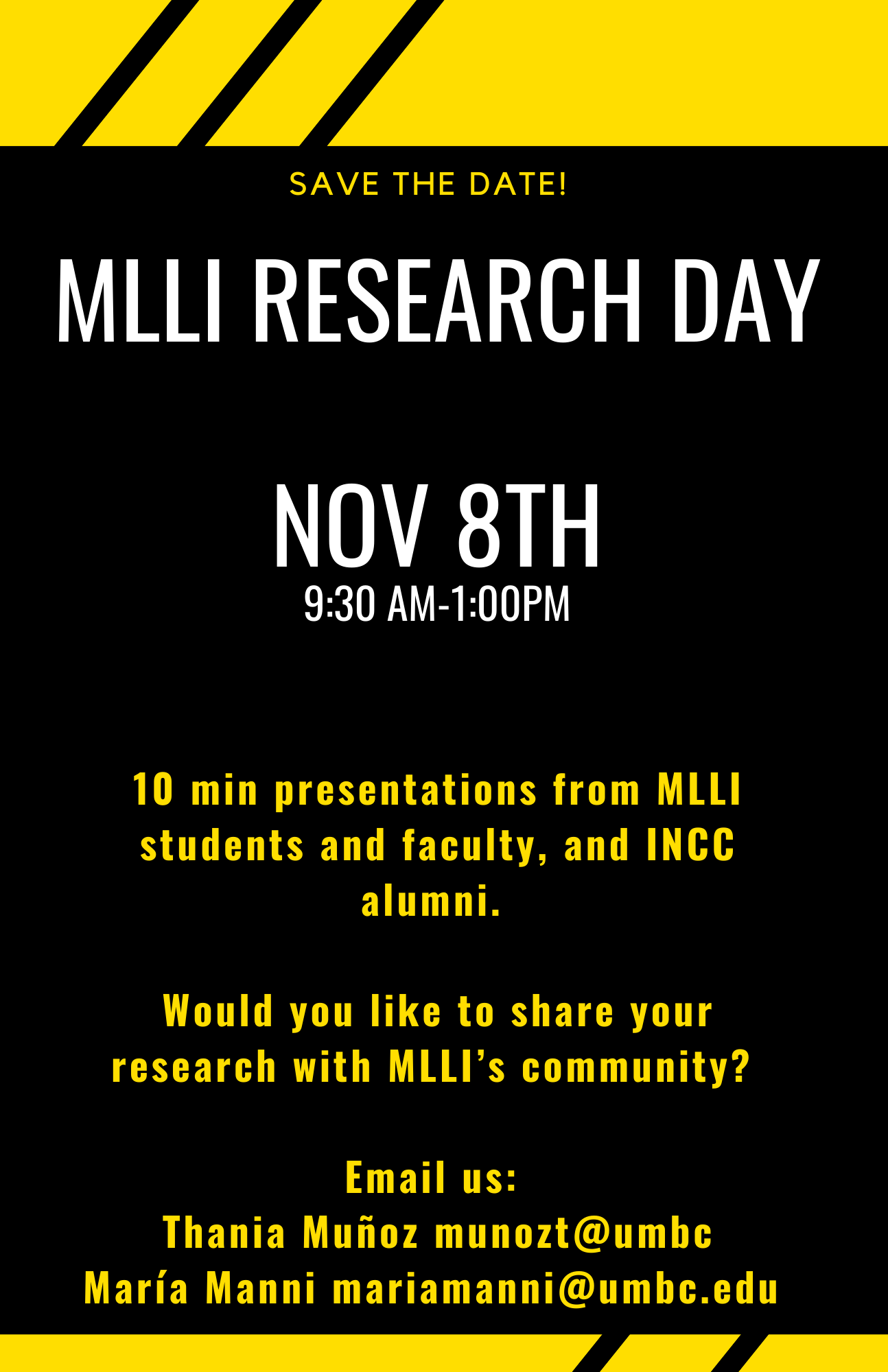 Please email us: Thania Muñoz, munozt@umbc.edu and María Manni,
