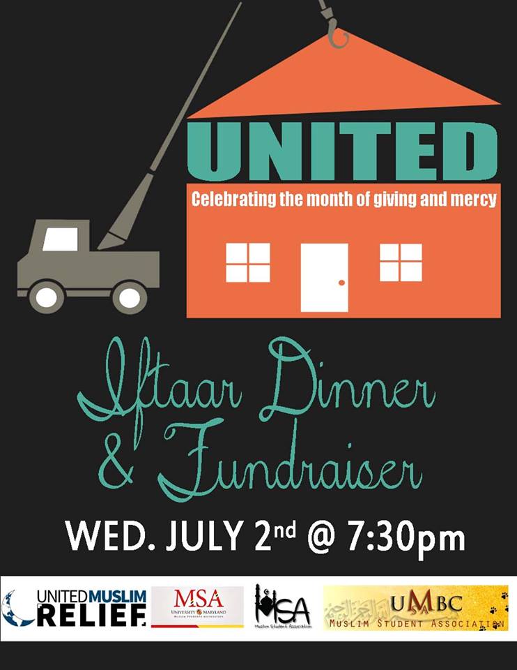 UMBC MSA, in collaboration with United Muslim Relief, Muslim Youth of MD, and UMCP, UB, and JHU MSAs invites all students and alumni to join us for Iftar on July 2nd (7:30pm-10pm).
