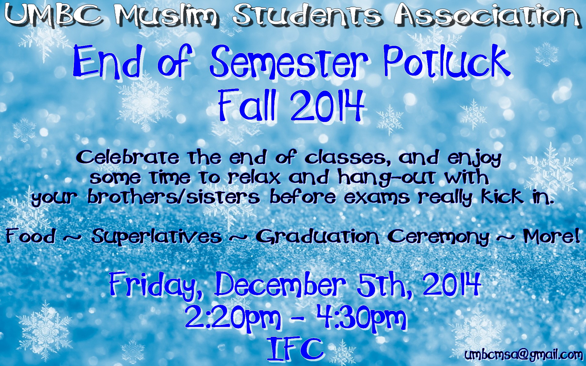 Celebrate the end of the semester with good food and good friends! Bring a dish and/or a friend! Make sure to vote on MSA Superlatives, which will be announced at the potluck. In addition, we will be recognizing those who are graduating (and graduates may chose to purchase MSA cords which they will receive at the potluck)