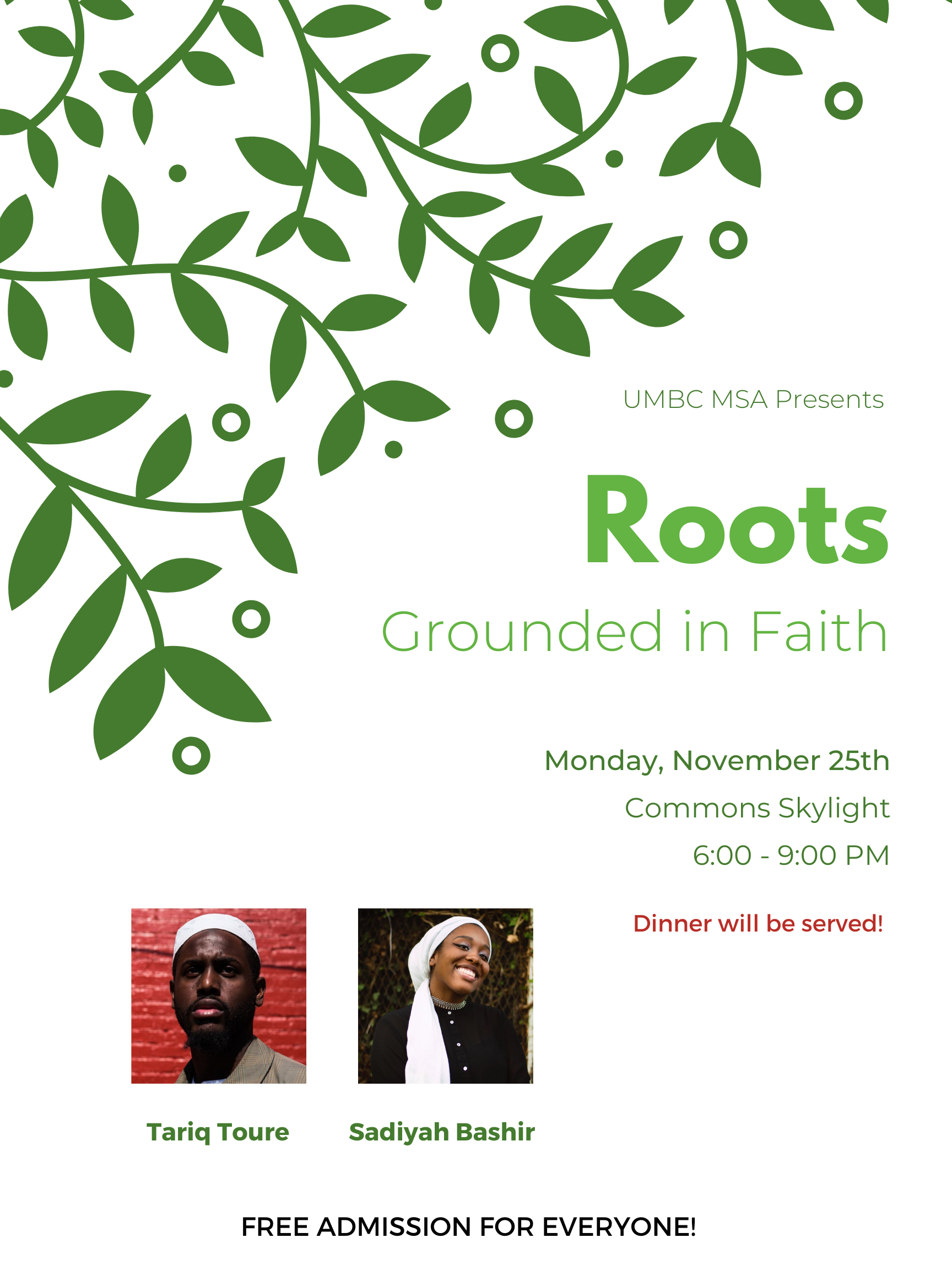 We invite friends and families of the MSA on Monday November 25th, to our main event Roots: Grounded in Faith with Brother Tariq Toure and Sister Sadiya Bashir.