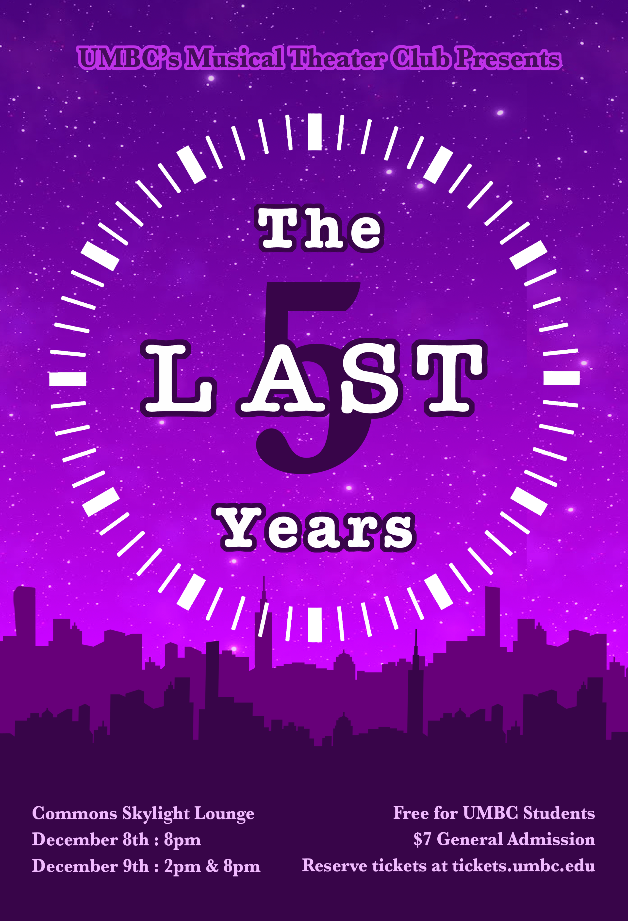 Our production of The Last Five Years is coming up soon! The show will take place on December 8th (8 PM) and 9th (2 PM & 8 PM) in the Skylight Lounge (Commons 3rd Floor). Tickets will be on sale soon, so keep an eye out for those! There is a poster for the show (designed by Ann) attached below!