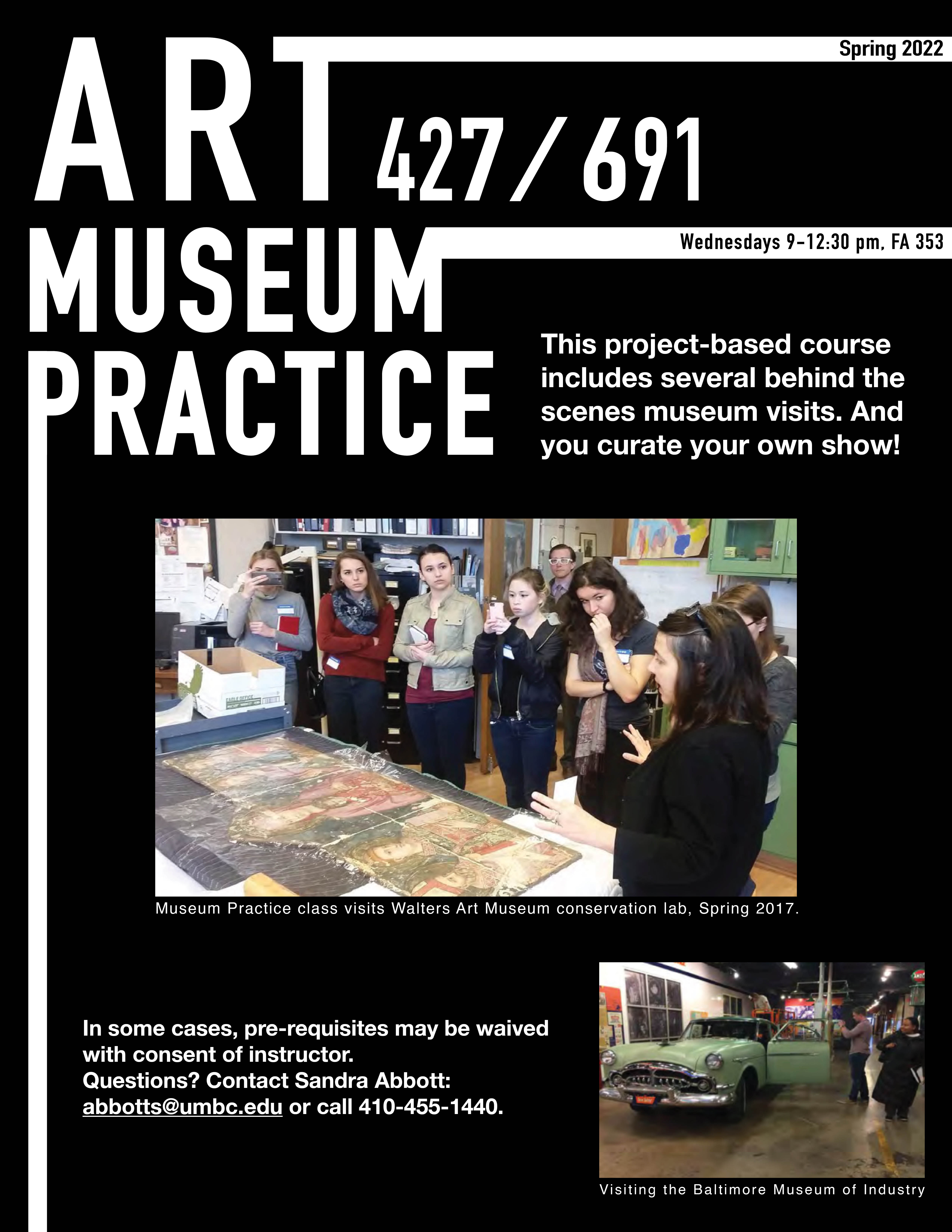 Please note, the course is listed as a hybrid this spring, so that if needed we can seamlessly pivot to an online course. For the most part, however, classes will take place at UMBC or off campus institutions in the area.