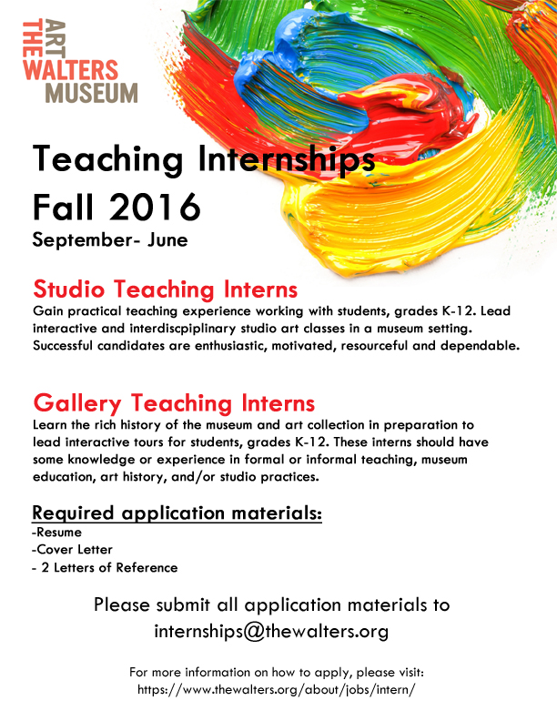 We are pleased to announce our fall 2016 internship opportunities to offer students hands on experience in various fields. The goal of our internship program is to provide students with enriching opportunities which inspire their purposeful career development. I have attached a list of available positions, please feel free to share this with your students and faculty members. Anyone interested in applying should email their resume, cover letter and other specified application materials to internships@thewalters.org by Sunday, August, 21, 2016.