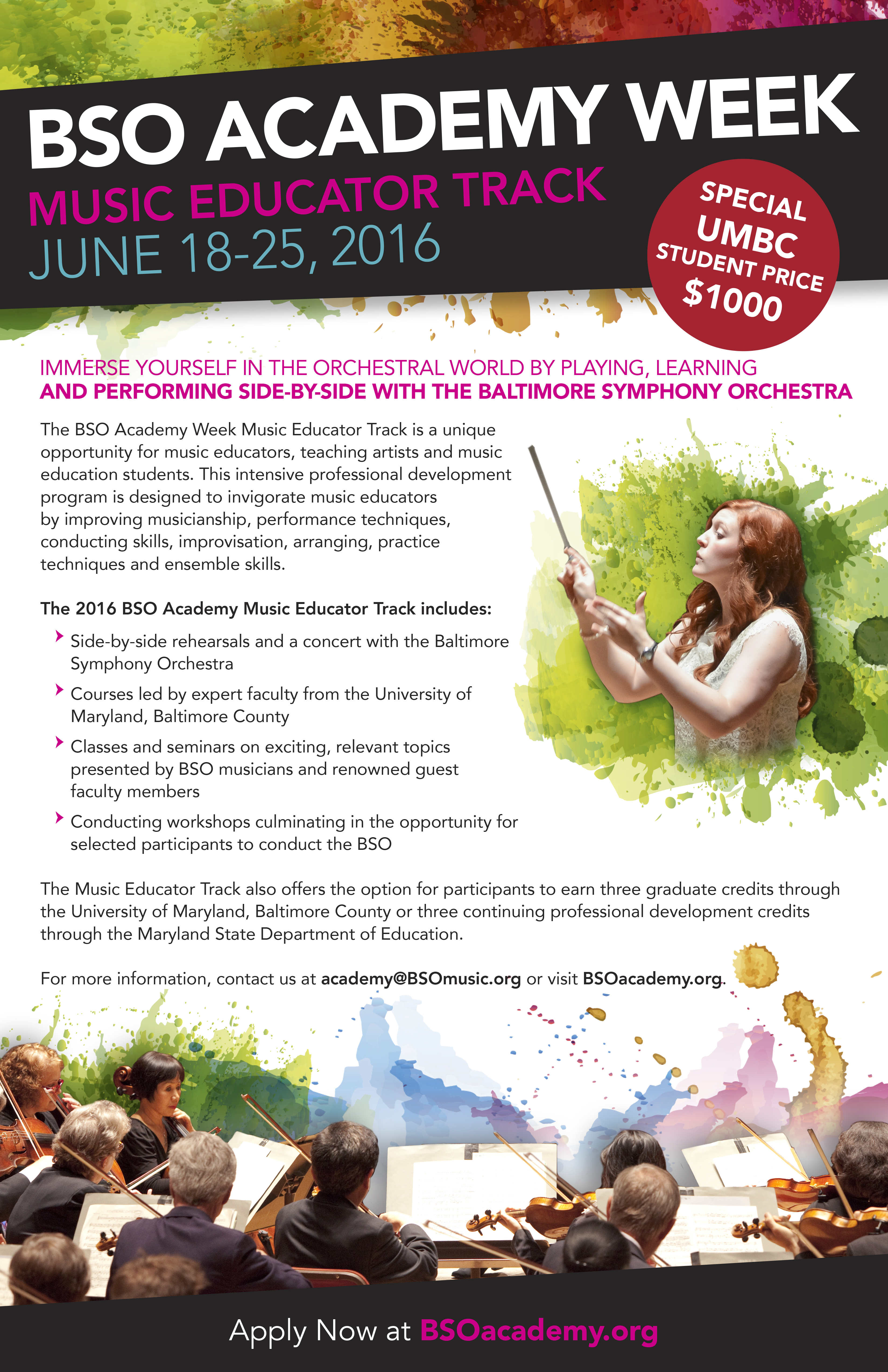 The Music Educator's Track of the Baltimore Symphony Orchestra's Academy Week is still accepting applications! They are offering a UMBC student price of $1000 for the week. Visit our website for more details.