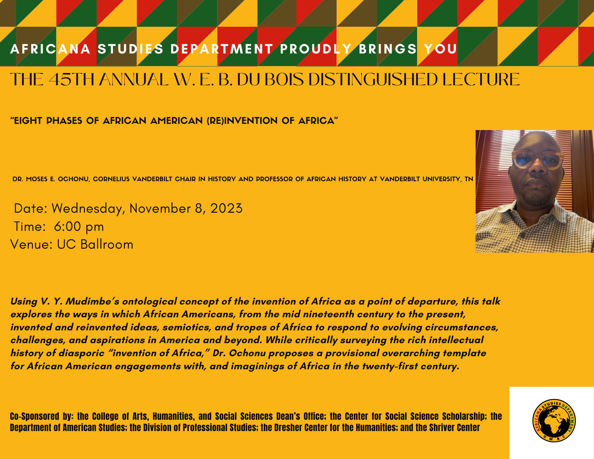 You are invited to the 45th Annual Du Bois Distinguished Lecture on November 8, 2023 at 6 pm. This year's guest speaker is Dr. Moses Ochono of Vanderbilt University, TN, who will be discussing the "Eight Phases of African American (Re)Invention of Africa." Dr. Ochonu is scheduled to meet with AFST students and faculty in Fine Arts 559 at 2:30-4:00 pm. The lecture is at UC Ballroom, 6 pm with UMBC Jubilee Choir performing, followed by a Q&A session and book signing.