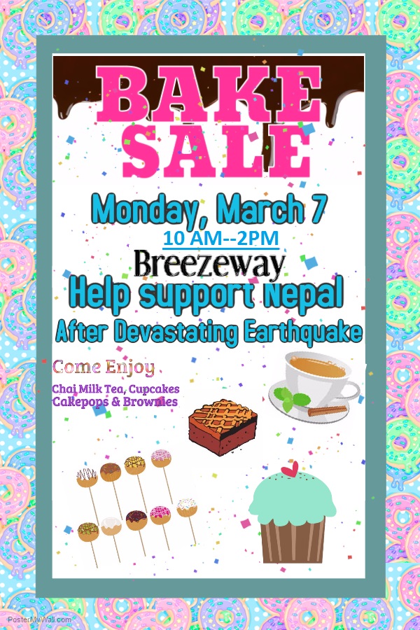Support newly formed Nepali Student Association, Monday, March 7 with CHAI MILK TEA, CUPCAKES,CAKE-POPS AND BROWNIES.