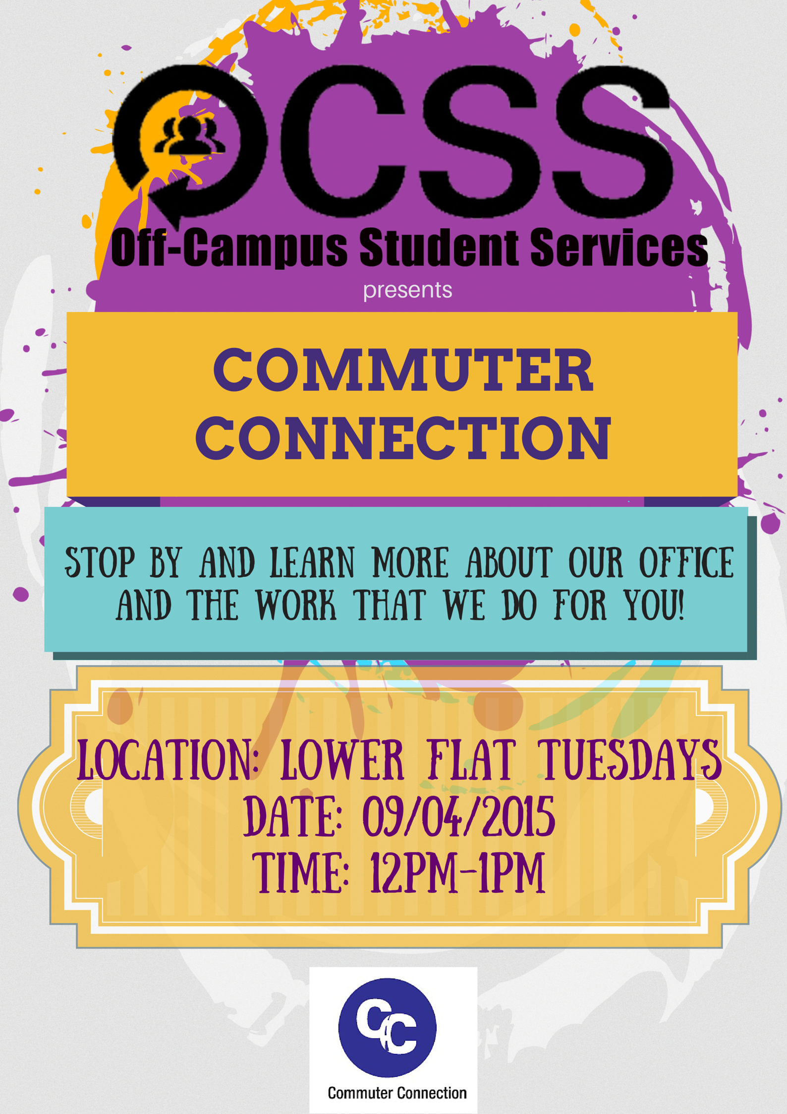 OCSS is back with a bang for the new school year! Want to learn about all the fun places to go that are off campus, or want information about off-campus living, among many other things? Commuter Connection is for you. OCSS is hosting it's first full throttle Commuter Connection event this Friday. There will be FREE food, great information and good socializing. Come get to know our office. We hope to see you all there!