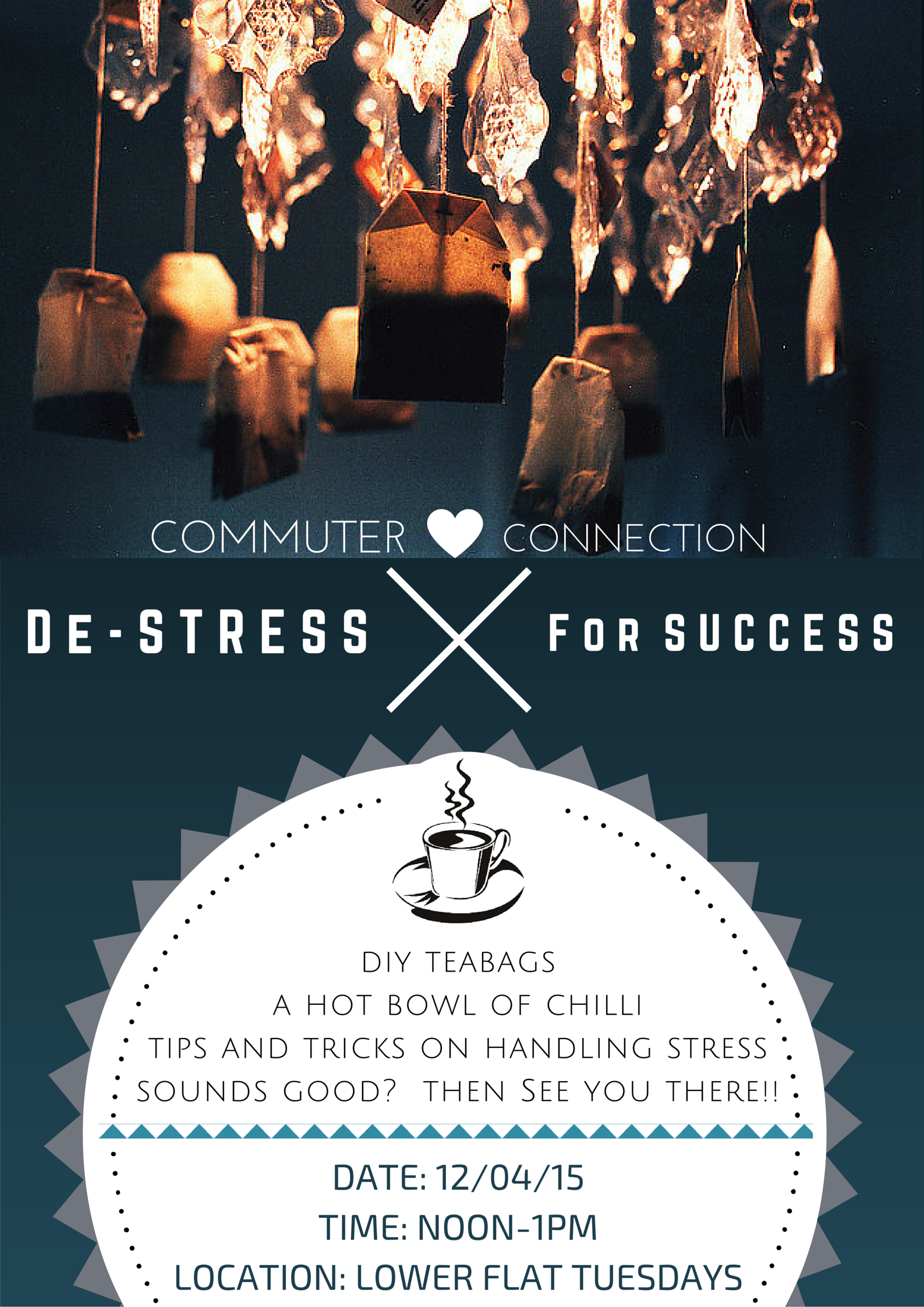 Come and celebrate our last Commuter Connections event of the semester. The theme of our event will be de-stressing from the semester and preparing for finals exams. We will have resources for students to take advantage of from tips and tricks to managing stress to tips on studying for finals. FREE lunch will also be provided for those who stop by. We will also be teaching students how to make their own tea bags. We hope to see you all there. Good luck with finals and the last week of classes everyone!