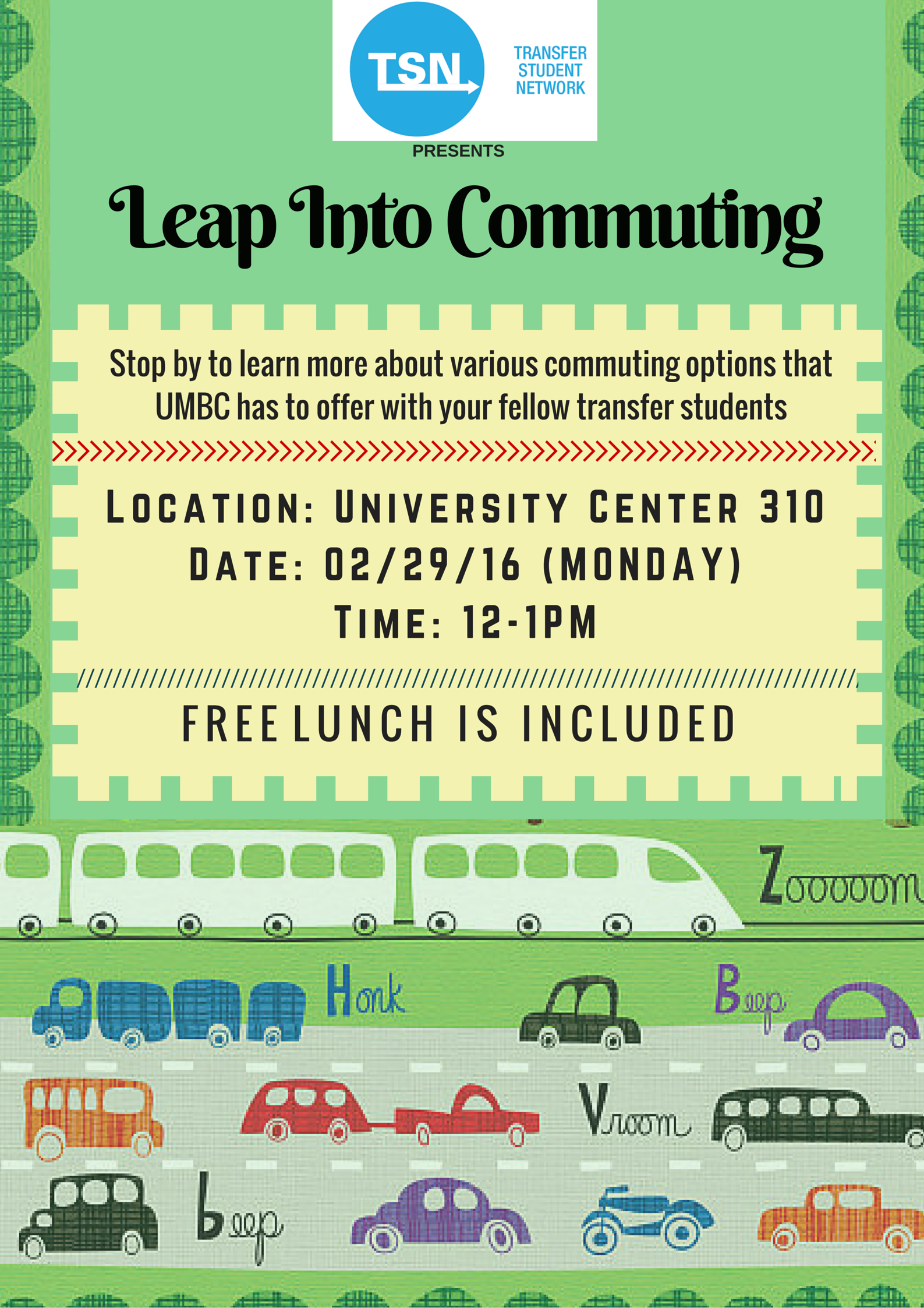 We are excited to announce the first Transfer Student Network Social of the semester! Join your fellow transfer students in learning more about the various AWESOME commuting options available to YOU at UMBC! Learn more about carpooling, UMBC Transit, and even commuter meal plans!