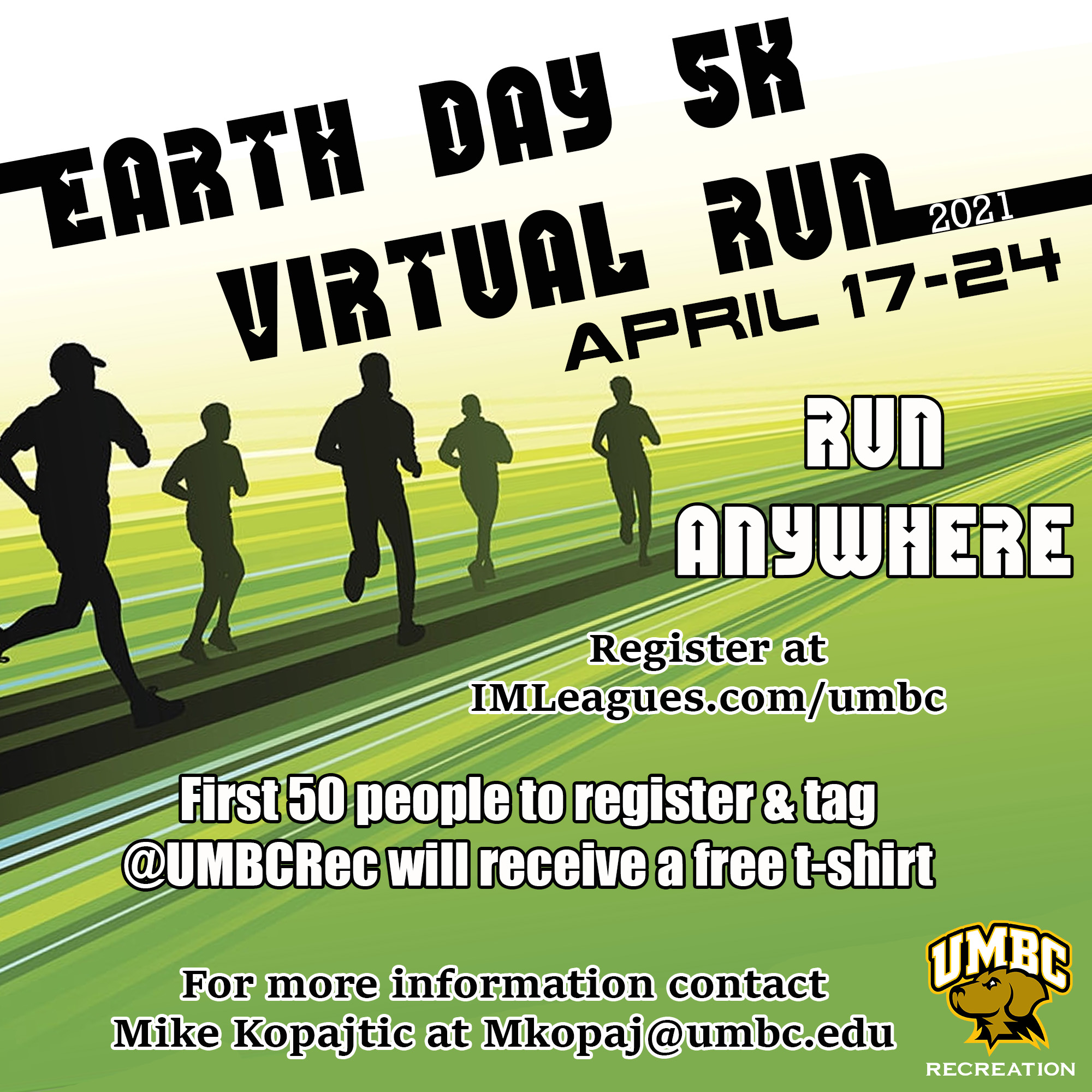 Participate in UMBC Recreation's 2021 Earth Day Virtual Event happening 4/17-4/24. The first 50 people to register and tag @UMBCRec will receive a FREE t-shirt!