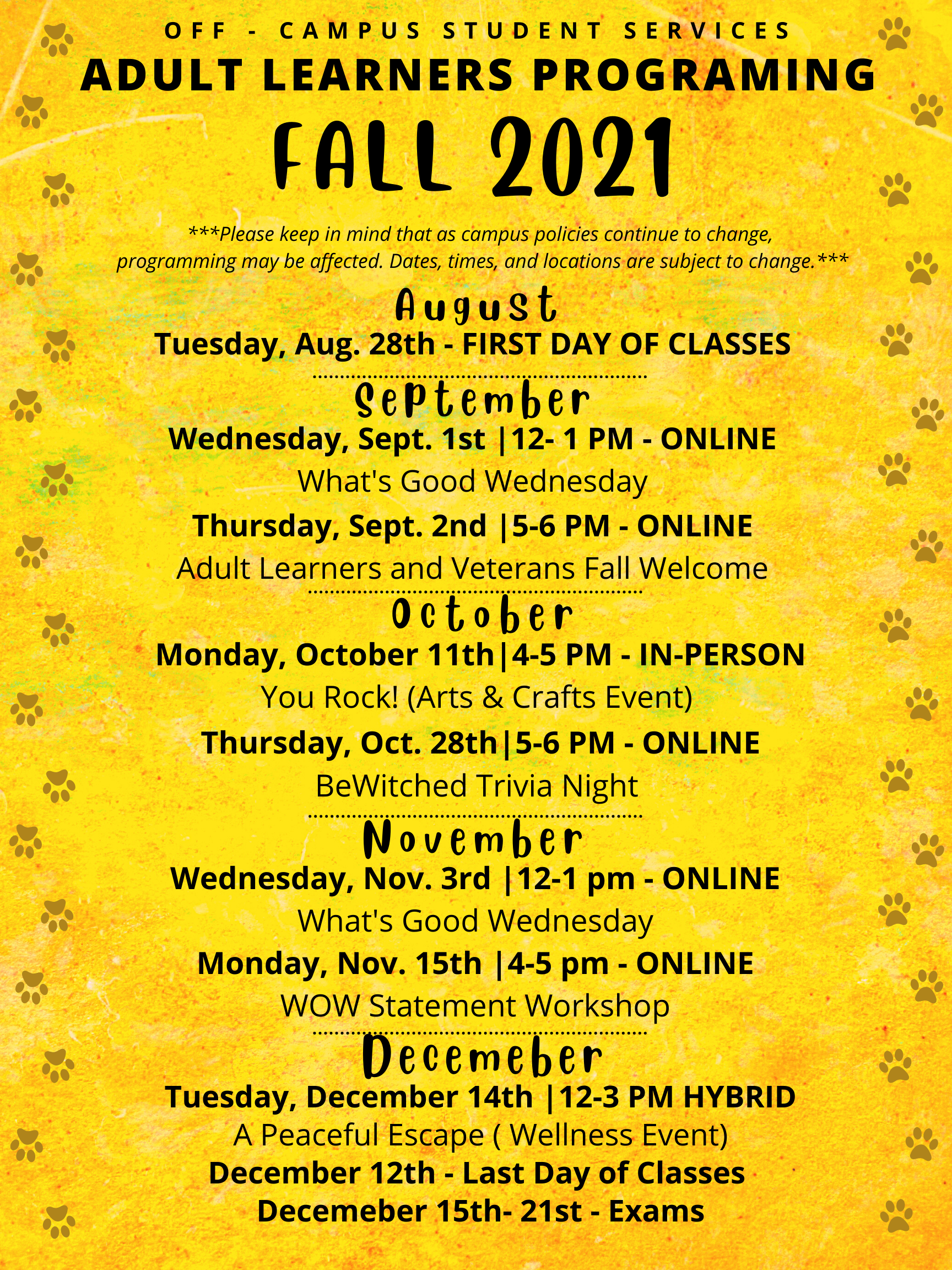 Adult Learners Fall 2021 Schedule of Events