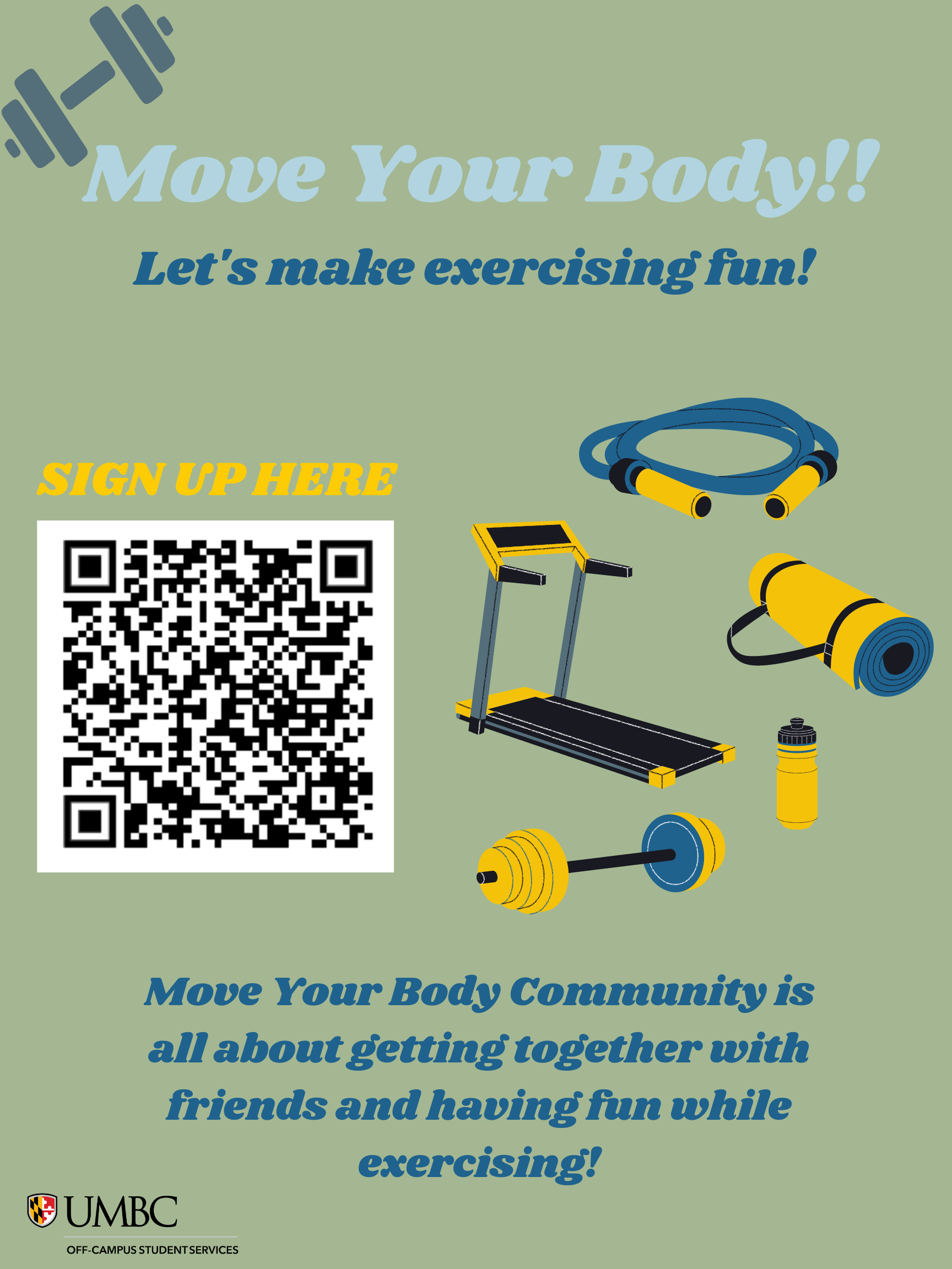 Have you ever wanted to go to a RAC class or even just the gym and felt nervous or anxious to go alone? Fear no more! The Move Your Body Community is all about getting your body active and having fun with friends. If you are a transfer student or know a transfer student at UMBC that would be interested in joining this community please click here OR scan the QR code below!!