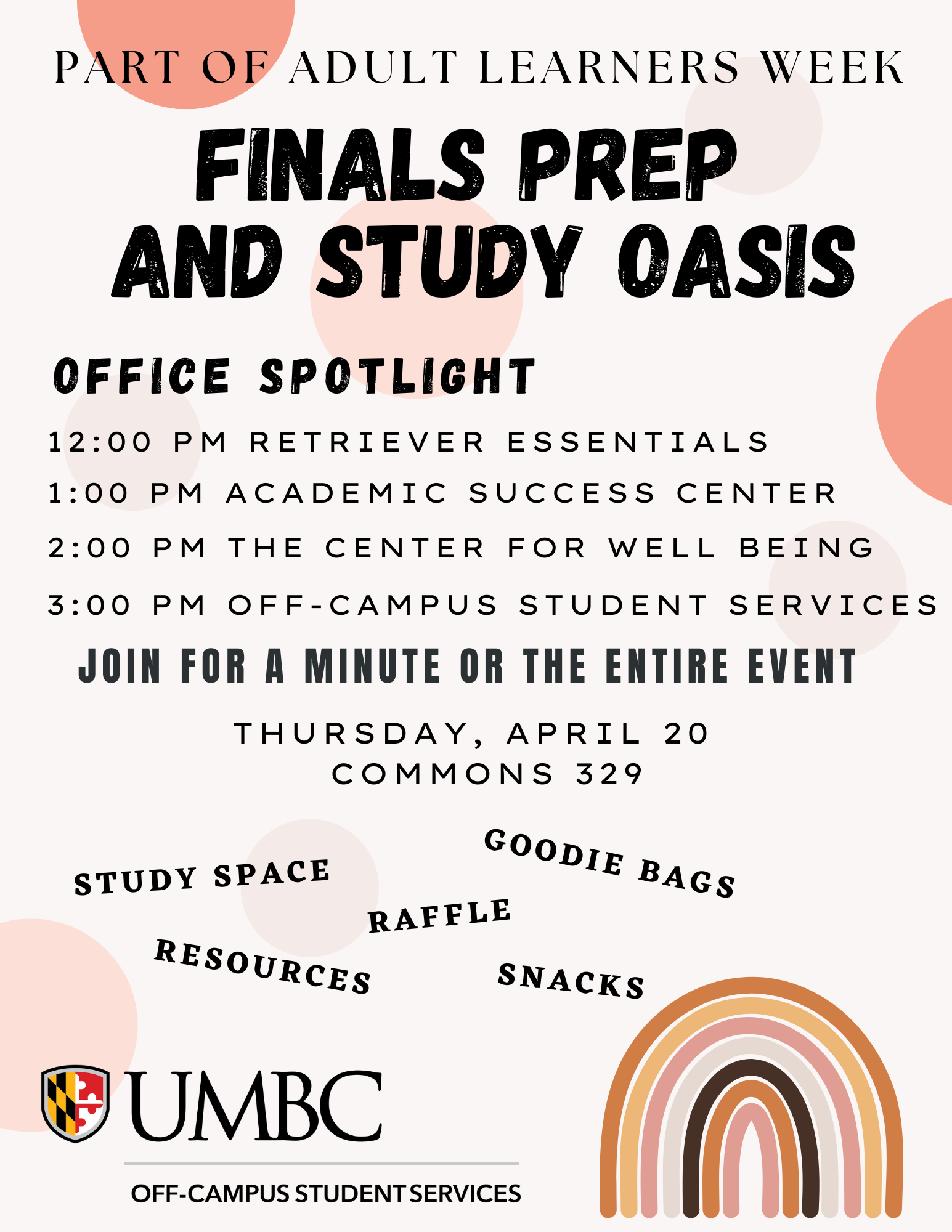 Join Off-Campus Student Services as we celebrate UMBC's Adult Learner community. Stop by our event on Thursday, April 20 for a minute or stay for the entire event. We will have tables set up for studying as well as snacks and raffles. We will have office spotlights every hour. Additionally, each office will be available to share how their office can help you get ready for finals and help assist you during the finals rush.