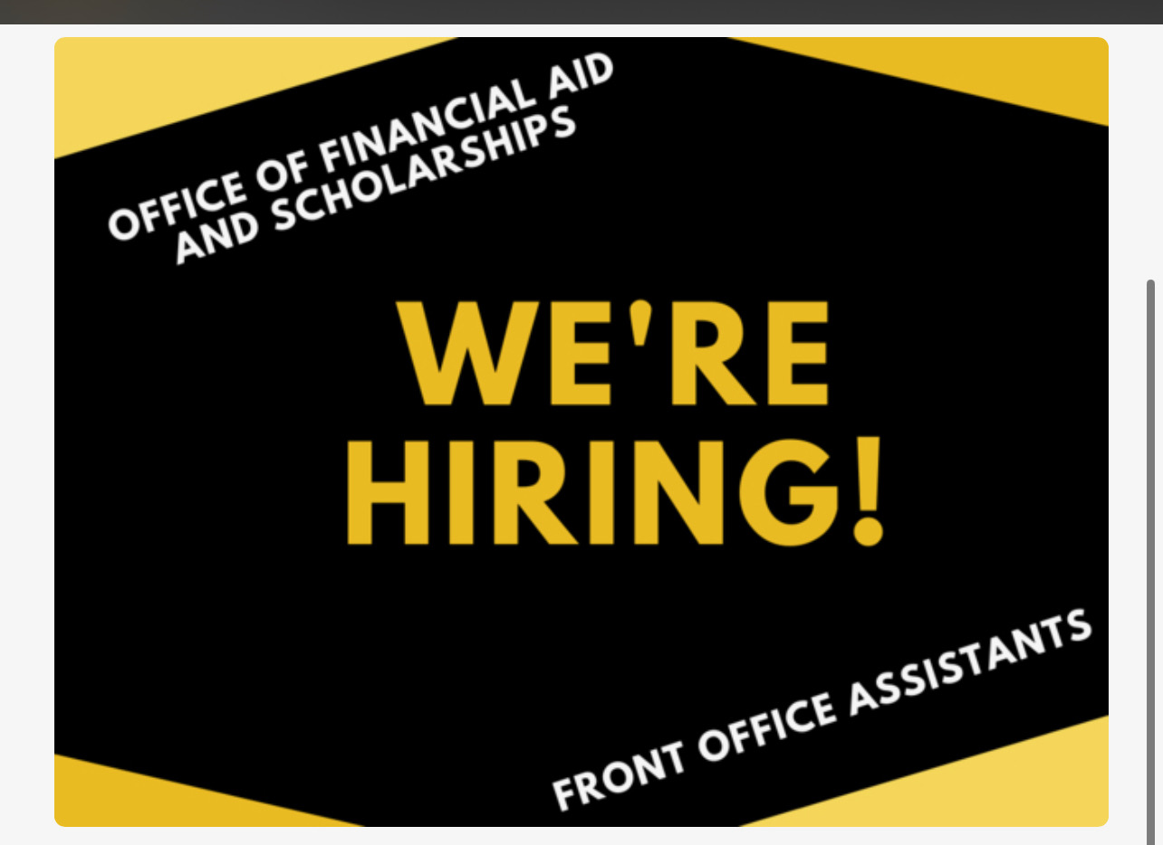The Office of Financial Aid & Scholarships is hiring Front Office Assistants. We are looking for focused and detail-oriented undergraduate students to fill vacancies beginning November 13th. The position does require on campus availability.