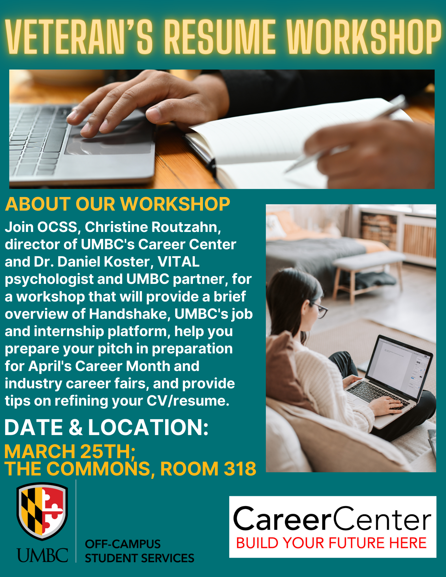 Join OCSS, Christine Routzahn, Director of UMBC's Career Center and Dr. Daniel Koster, VITAL psychologist and UMBC partner, for a workshop that will provide a brief overview of Handshake, UMBC's job and internship platform, help you prepare your pitch in preparation for April's Career Month and industry career fairs, and provide tips on refining your CV/resume. Hope to see you there!
