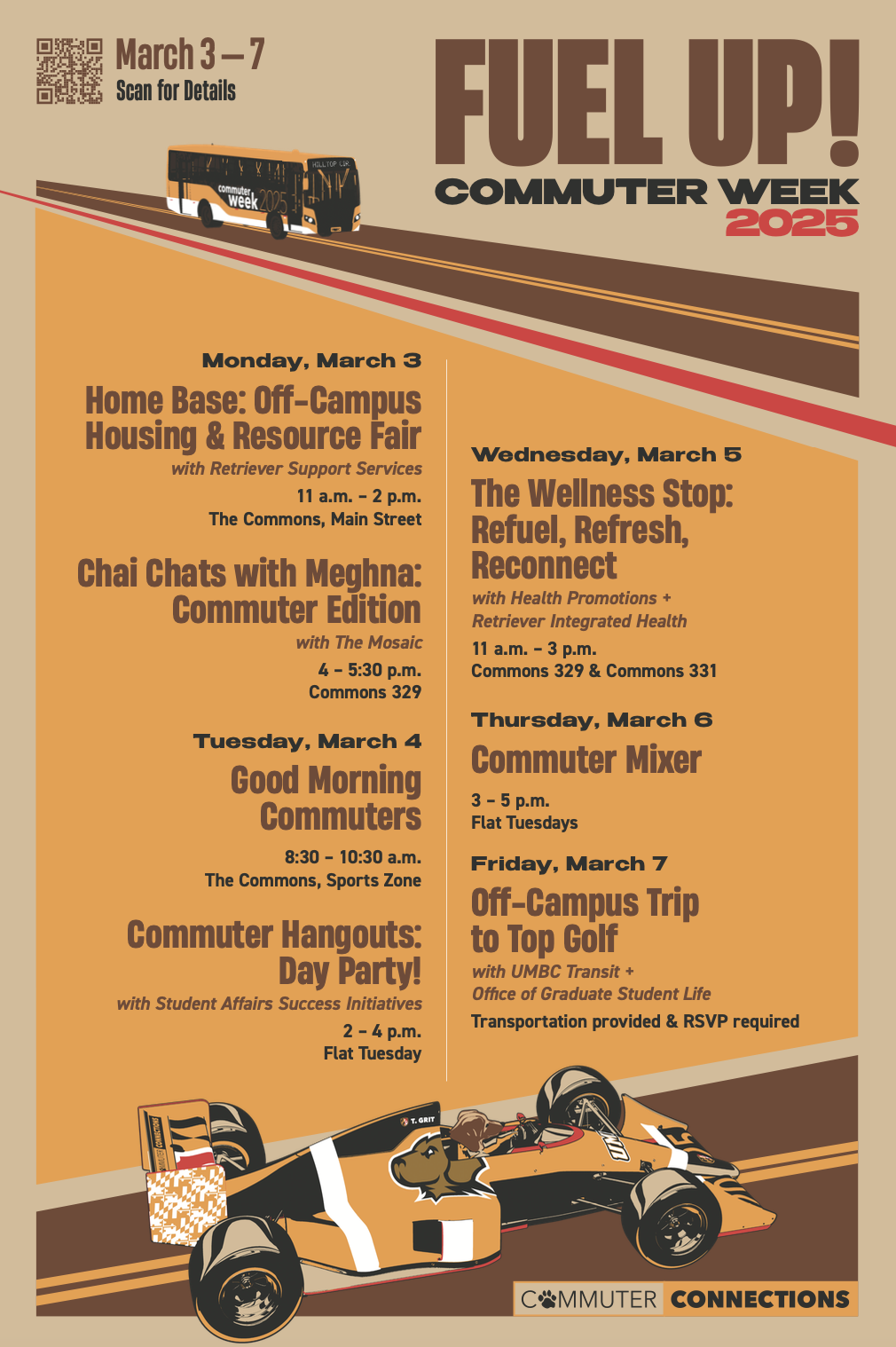 Commuter students, this week is all about YOU! Join us for a week full of exciting pit stops designed to refuel, recharge, and celebrate the commuter experience. From free food and fun giveaways to wellness breaks and off-campus adventures, there’s something for everyone!