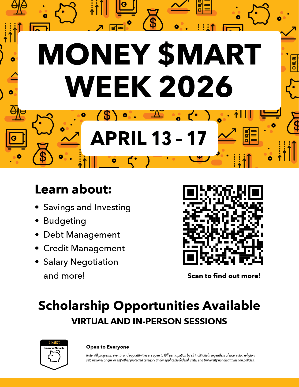 Join the Office of Financial Aid & Scholarships, Monday, April 13 – Friday, April 17, for a week full of resources, events, and opportunities to help you build your financial future! From budgeting tips to scholarship support, this week is all about helping you get money smart. 💰