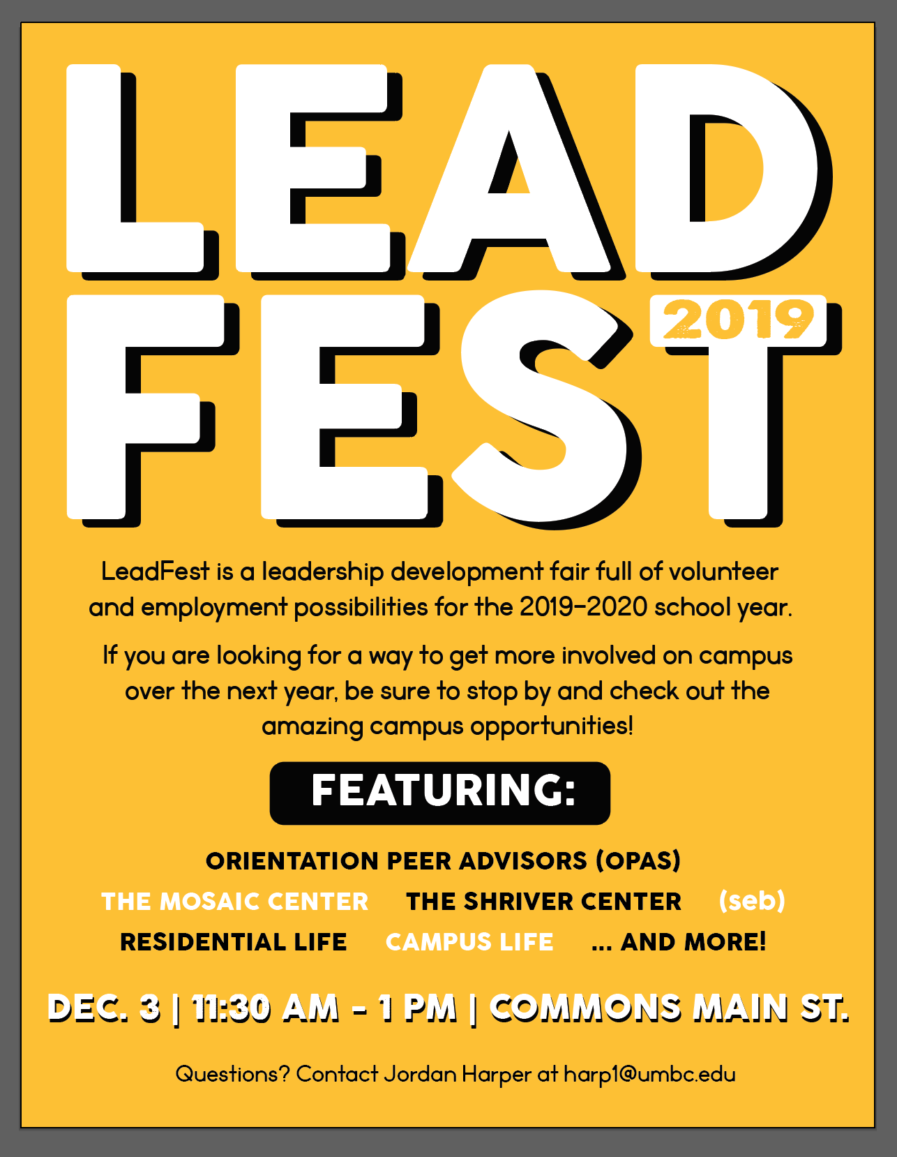 Looking for ways to promote your leadership on campus in the coming year?? LeadFest is a unique leadership development fair full of volunteer opportunities and employment possibilities for the 2019-2020 school year.