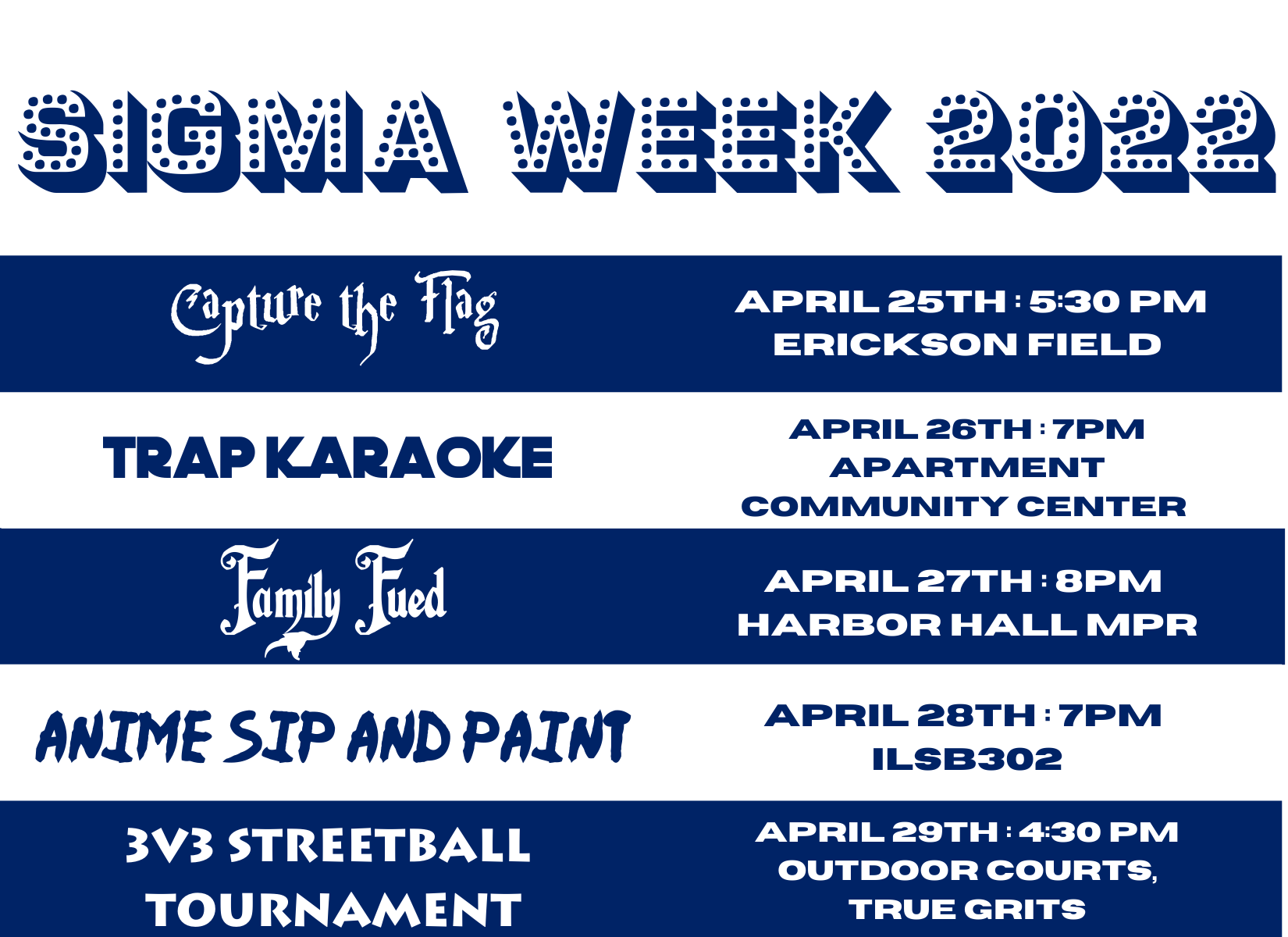 We have so much in store that's planned for Sigma Week for all of you to come out and have a good time! We're all about creating an exceptional experience for the students at our wonderful university.