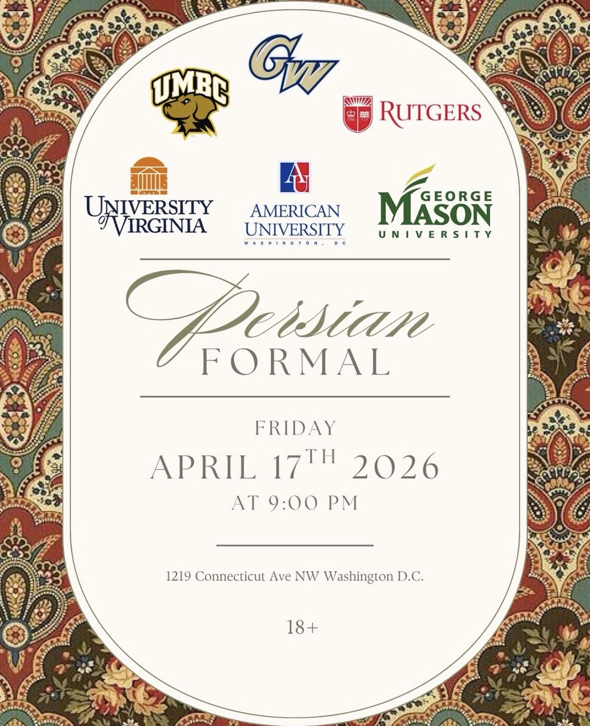 Ticket Link: https://www.eventbrite.com/e/persian-formal-dc-friday-april-17th-2026-tickets-1986438783876?aff=oddtdtcreator&keep_tld=true&utm_source=ig&utm_medium=social&utm_content=link_in_bio&fbclid=PAZnRzaARCQGxleHRuA2FlbQIxMQBzcnRjBmFwcF9pZA8xMjQwMjQ1NzQyODc0MTQAAacx7FOuYXo9b7YEjUiTtS6YN0fVg6eb0fWshLVFLhR23ykX79xbKM6rC1nCiQ_aem_y0aqnkjq7owY4jA4ILq54Q
