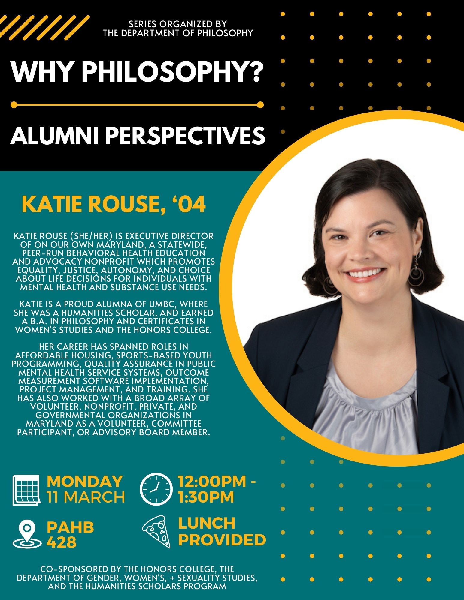 I hope this email finds y'all well. On Monday, March 11th, from 12-1:30pm, a UMBC Alumna, Katie Rouse, will be giving a talk in PAHB 428. She'll be discussing her experience of having a philosophy degree and her endeavors after graduating! LUNCH WILL BE PROVIDED!!!!! Please see the attached flyer for more detailed information! If you're interested in majoring, minoring, or getting a certificate in philosophy, this is a great talk to attend! And even if you're not, you may as well come anyhow :)