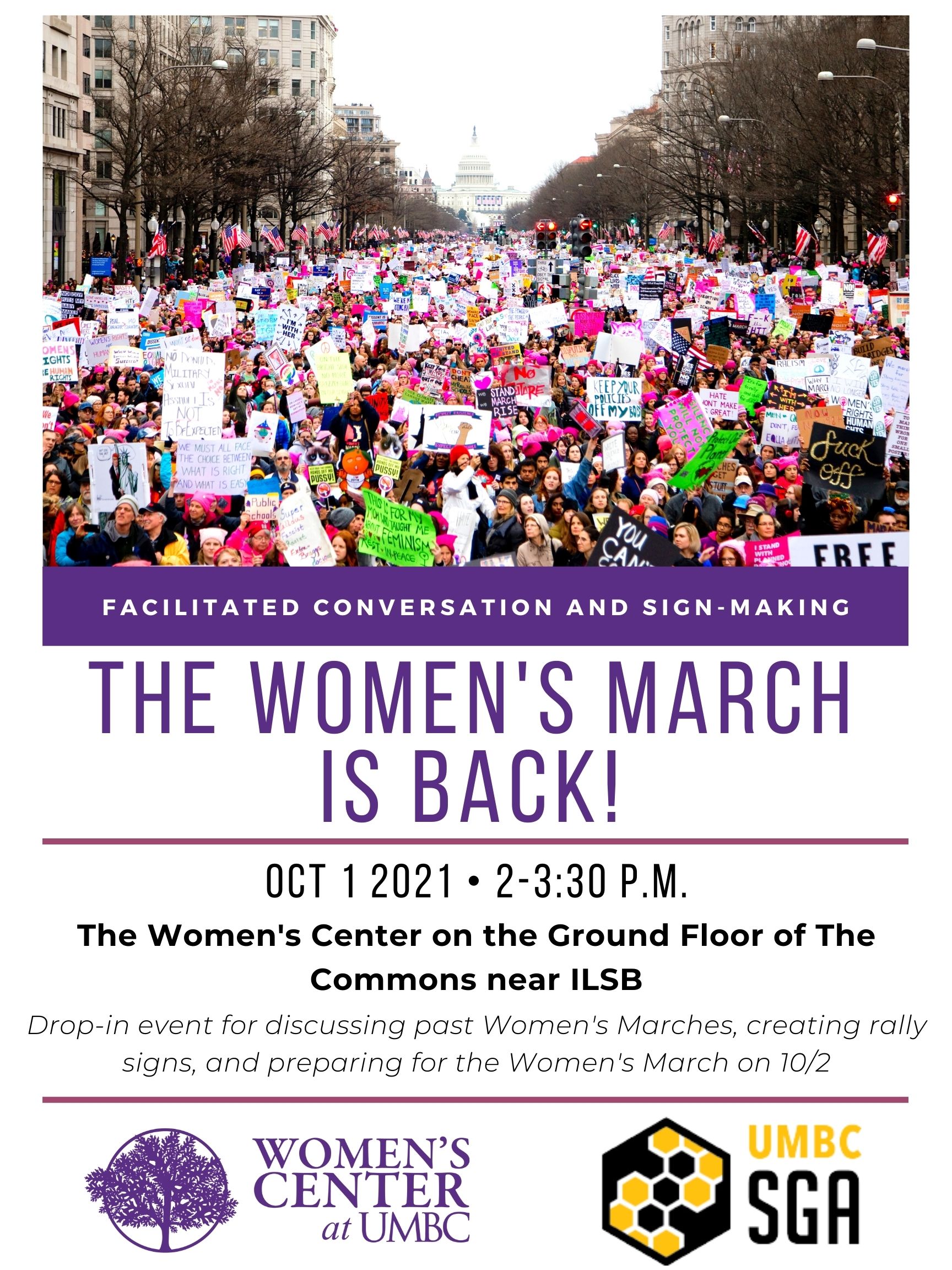 Join us in the Women’s Center (located on the ground floor of the Commons near the entrance closest to the ILSB) on October1st from 2 p.m. to 3:30 p.m. to participate in a facilitated conversation about how the Women’s March has impacted your lived experiences, create rally signs, and prepare for this year’s march. Materials and community space will be provided. We have markers, pens, and poster board.