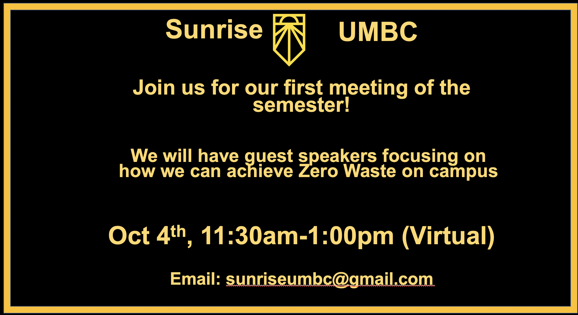 Sunrise Mvt. UMBC is having its first official meeting October 4th, and we are hoping to attract members in the Political Science department. We are a climate action group focusing on zero waste, divestment, and speedy decarbonization of our campus. Could you help us advertise? Although we are technically a GSO, we also want undergraduate students and professors.