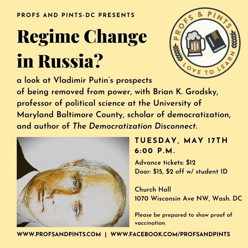 Profs and Pints DC presents: "Regime Change in Russia?" a look at Vladimir Putin's prospects of being removed from power, with Brian K. Grodsky, professor of political science at the University of Maryland Baltimore County, scholar of democratization, and author of The Democratization Disconnect.