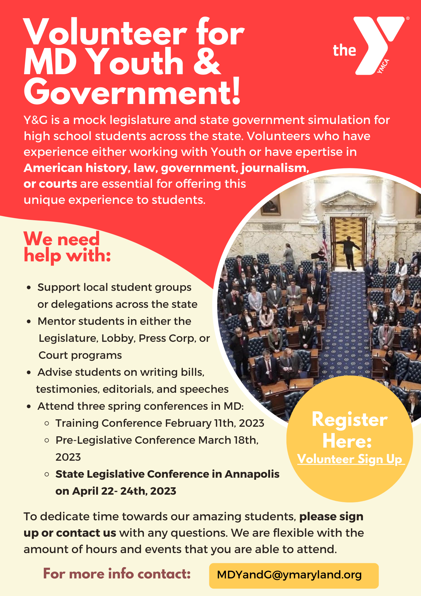 Maryland Y Youth & Government is a special program specifically designed to give high school students a hands-on lesson in how government works. Teens will learn how to elect their own leaders, debate, legislate bills, and lobby for their vision of a better future!
