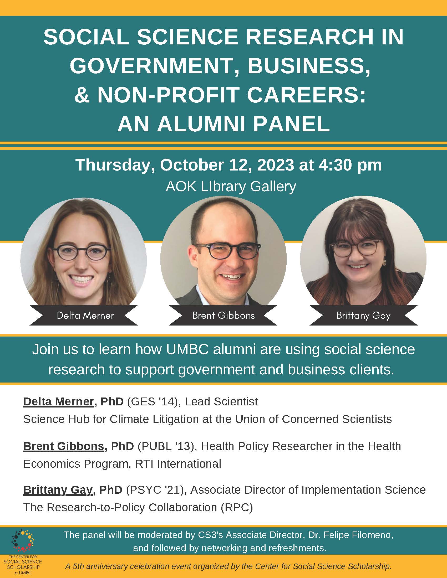 Research is about solving real world problems. The skills you learn while writing a research paper or taking a research methods course are valued in careers in government, business, and the non-profit industry. Join us to learn how UMBC alumni are using social science research to support government and business clients. The panel will be moderated by CS3's Associate Director, Dr. Felipe Filomeno, and will be followed by networking and refreshments.