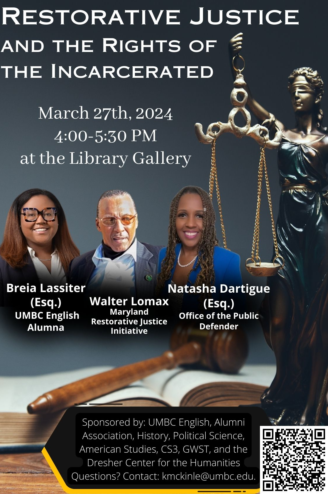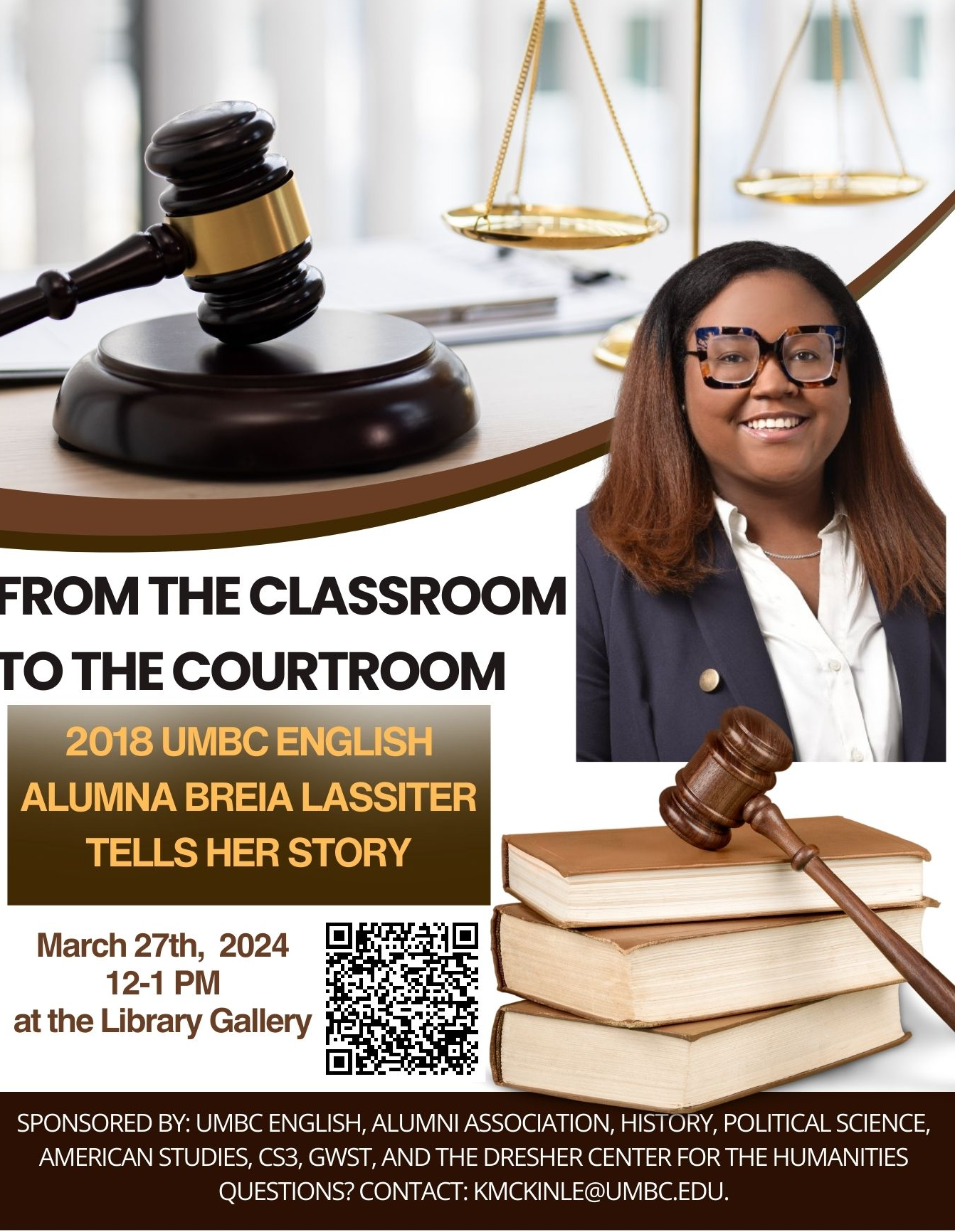 12-1 pm. Library Gallery. “From the Classroom to the Courtroom: 2018 UMBC English Alumna Breia Lassiter Tells Her Story.”