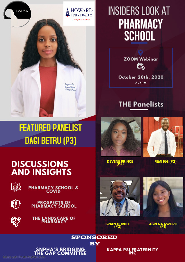 We will be having an "Insiders Look at Pharmacy School" panel discussion (hosted by Pharmacy students from the Howard University College of Pharmacy) tomorrow evening from 6-7pm on Zoom. This will be a perfect opportunity to get all of your Pre-Pharmacy-related questions answered! Attached, you will be able to find the flyer for the event.