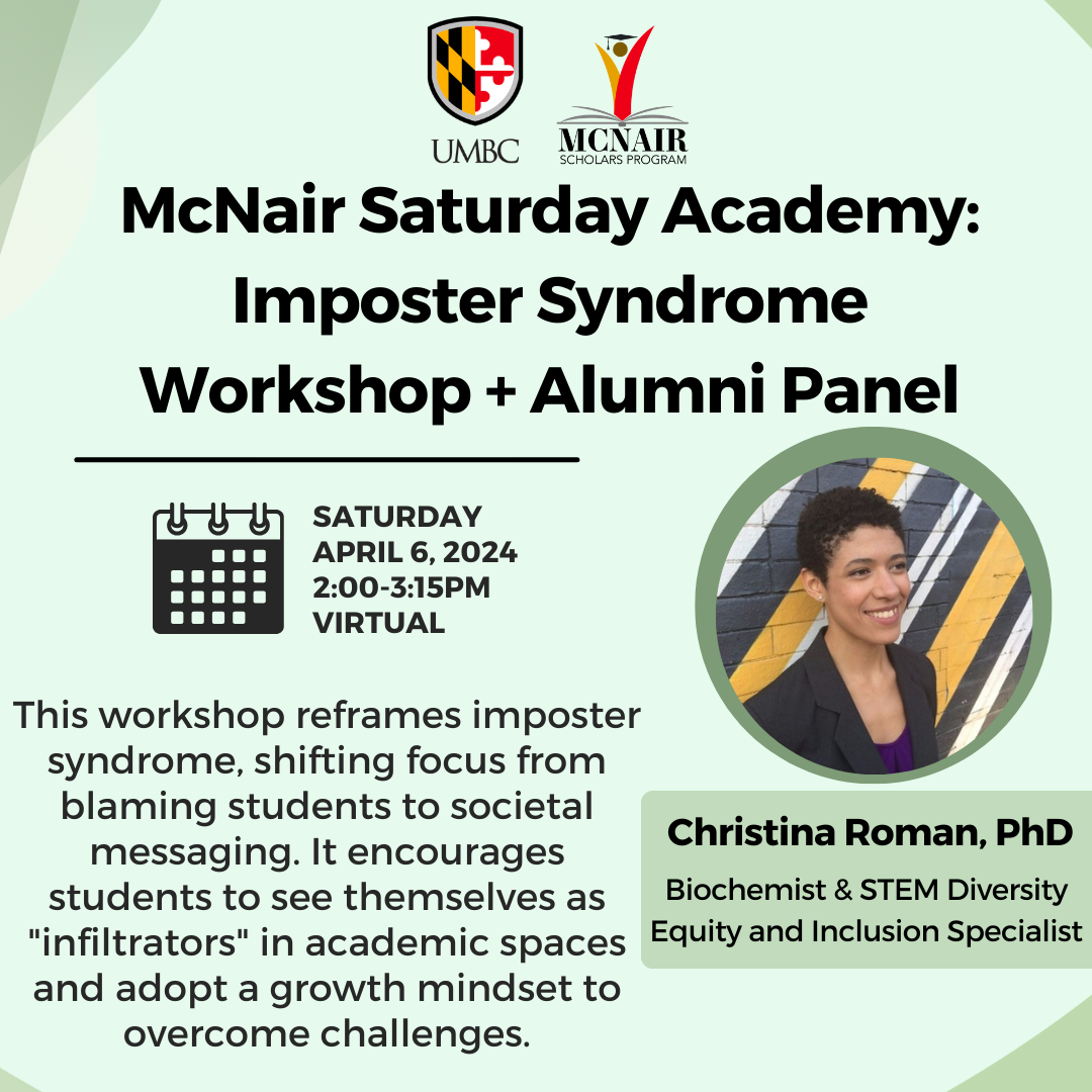 Join us for a transformative Saturday at McNair Sat. Academy! Combat imposter syndrome with Dr. Christina Roman's empowering workshop and connect with McNair alumni who've walked the same path. Mark your calendar for April 6, 1-3:15 PM. Don't miss out on this enriching experience! #McNairCommunity #ImposterSyndromeWorkshop