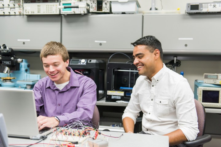 Nilanjan Banerjee (right) works with a student in his lab, 2017.