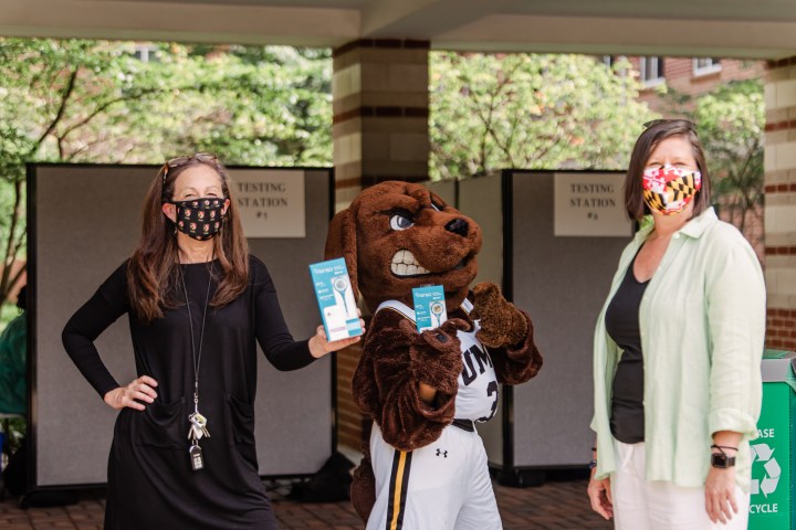 Nancy Young (left), True Grit, and Kate Tracy (right) at UMBC’s COVID-19 testing pilot, July 2020.