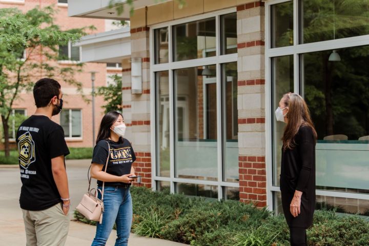 Nancy Young (right) with SGA President Mehrshad Devin (left) and Communications Director Calista Ogburn (center) on campus in July 2020.