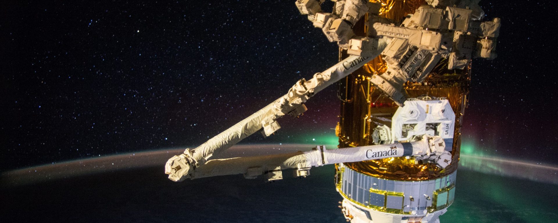 Banner image: A Japanese transfer vehicle (labeled HTV-5) is docked at the International Space Station. The CALET experiment is being extracted by the station’s robotic arm (labeled with “Canada”). Credit: NASA