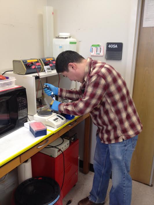 Rudy Park, who is funded by an IMET seed grant, works on the algal biofuels project in Professor Steve Miller's lab at UMBC. (Sarah Hansen)